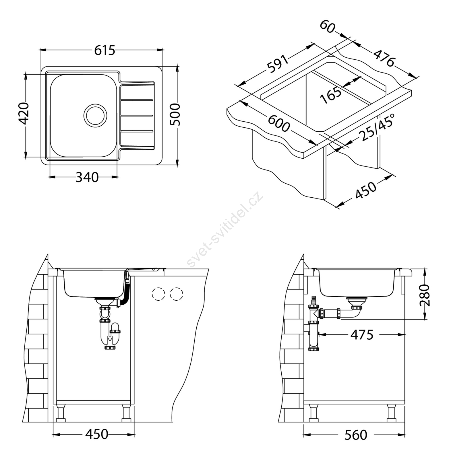 • Obsah balení: nerezový dřez, příchytky a těsnění, sítkový ventil 3 1/2, sifon s odbočkou na myčku.