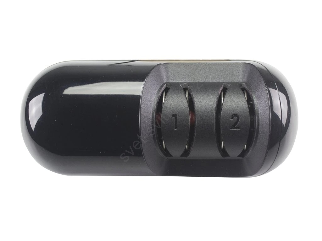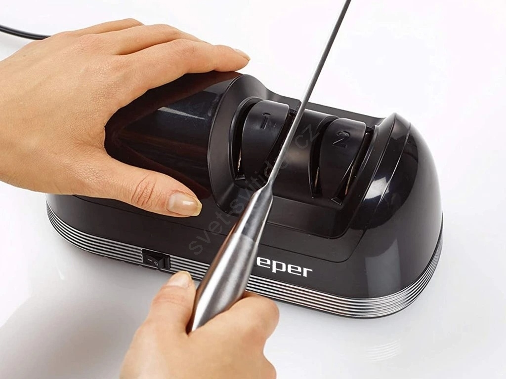 • Elektrický dvoukomorový brousek na nože je dodáván v elegantním černém designu.