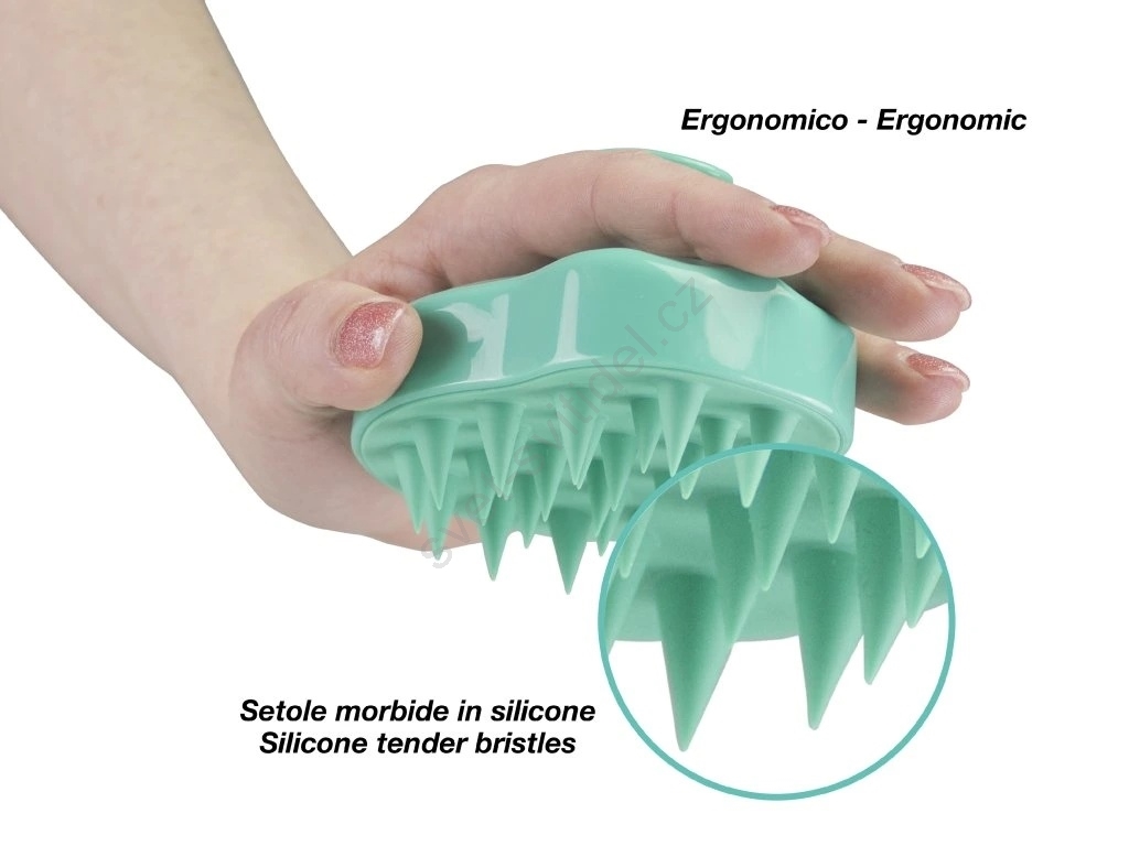 • Silikonové štětiny se dokonale přizpůsobí pokožce hlavy.