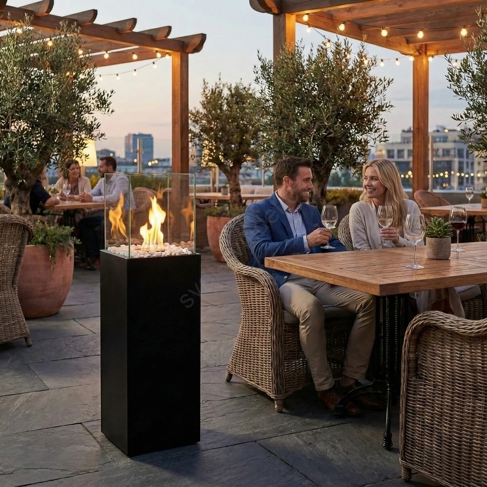 • Díky stabilní základně a 3 mm silnému skleněnému krytu si můžete být jisti, že oheň je bezpečný a pod kontrolou, a to i za větrného počasí.