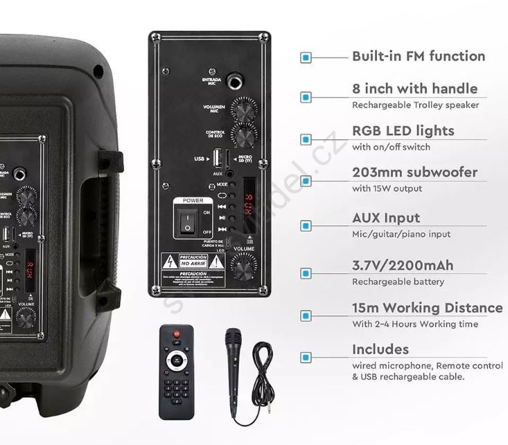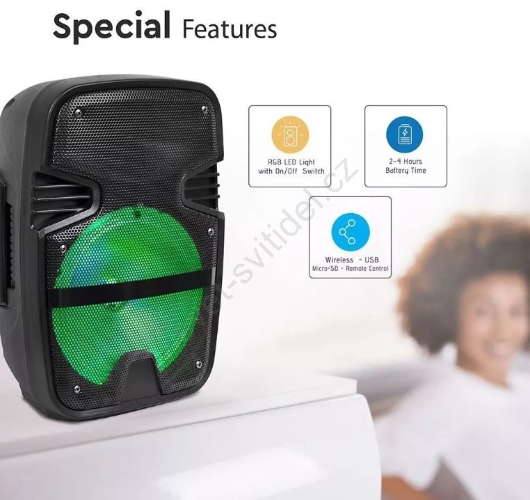 • Reproduktor je dodáván s kabelovým mikrofonem - ideální pro karaoke.