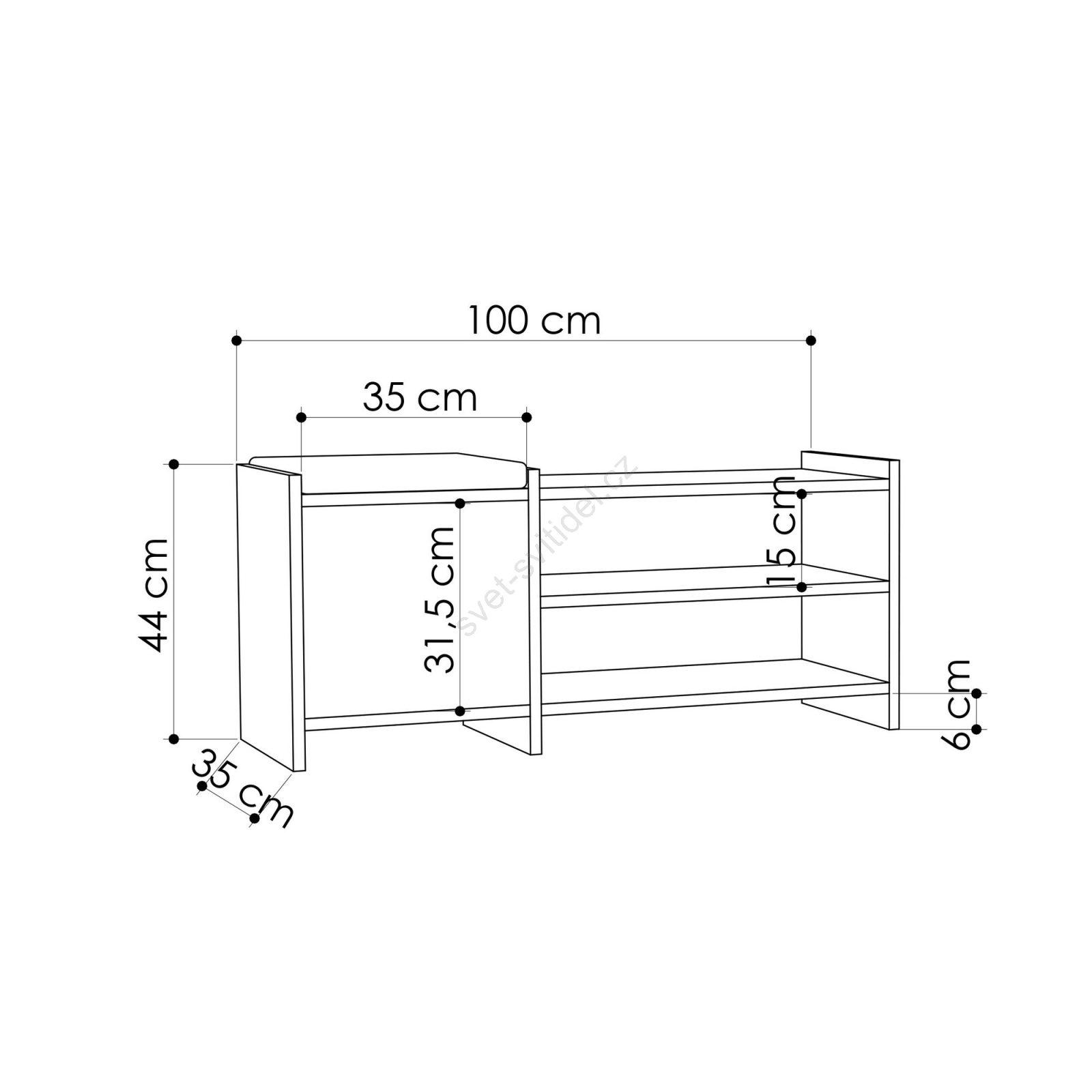 • Skládá se z 3 úložných polic a jedné skříňky na boty.