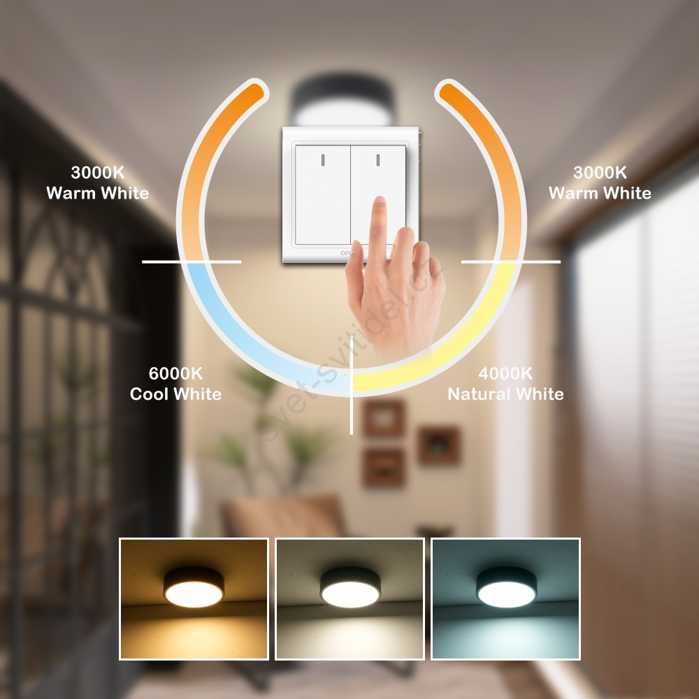 • Změna teploty chromatičnosti krokově jednoduchým stiskem nástěnného vypínače.