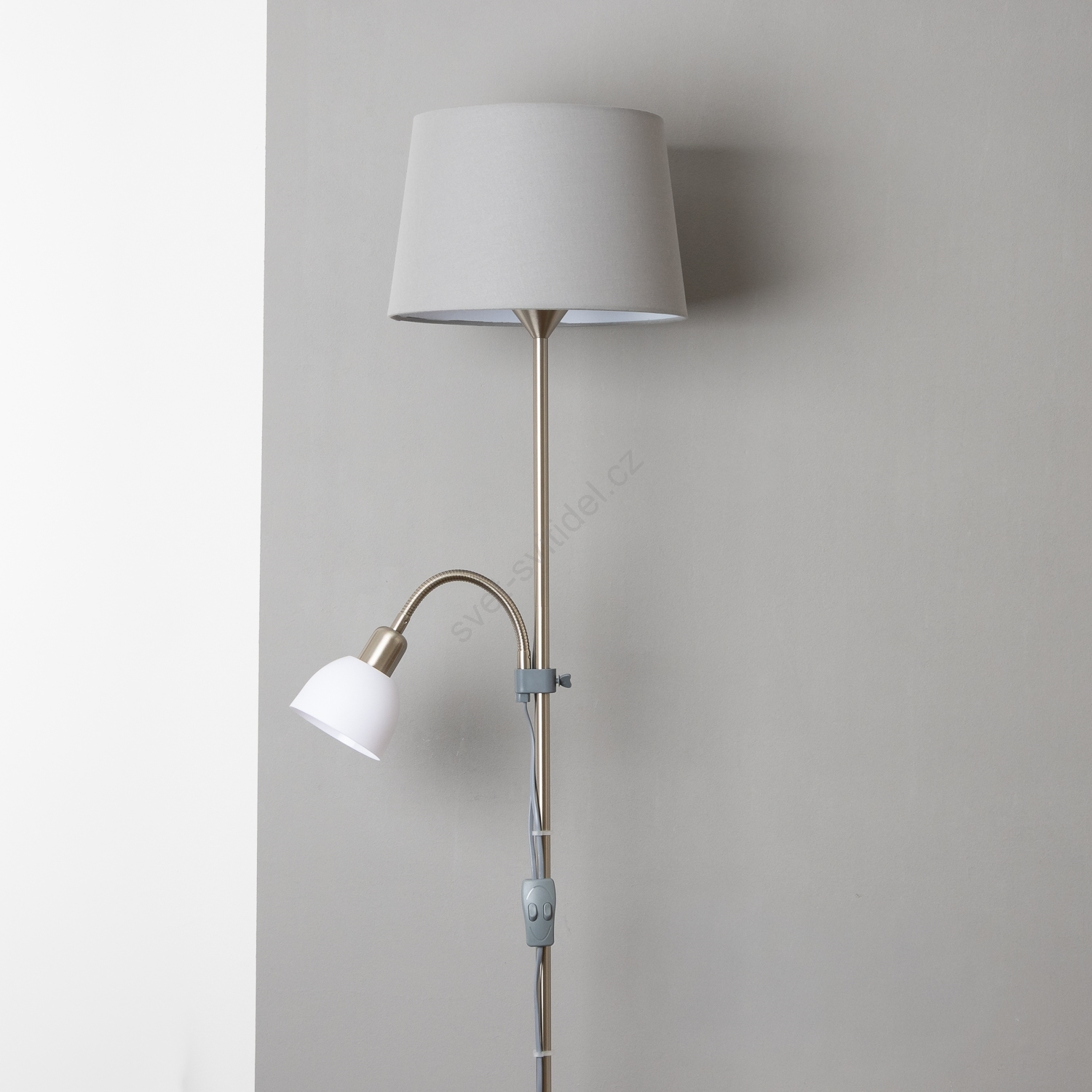 • Kompletní balení obsahuje chromovou základnu s čtecí lampičkou, bílé plastové stínidlo a šedé textilní stínidlo.