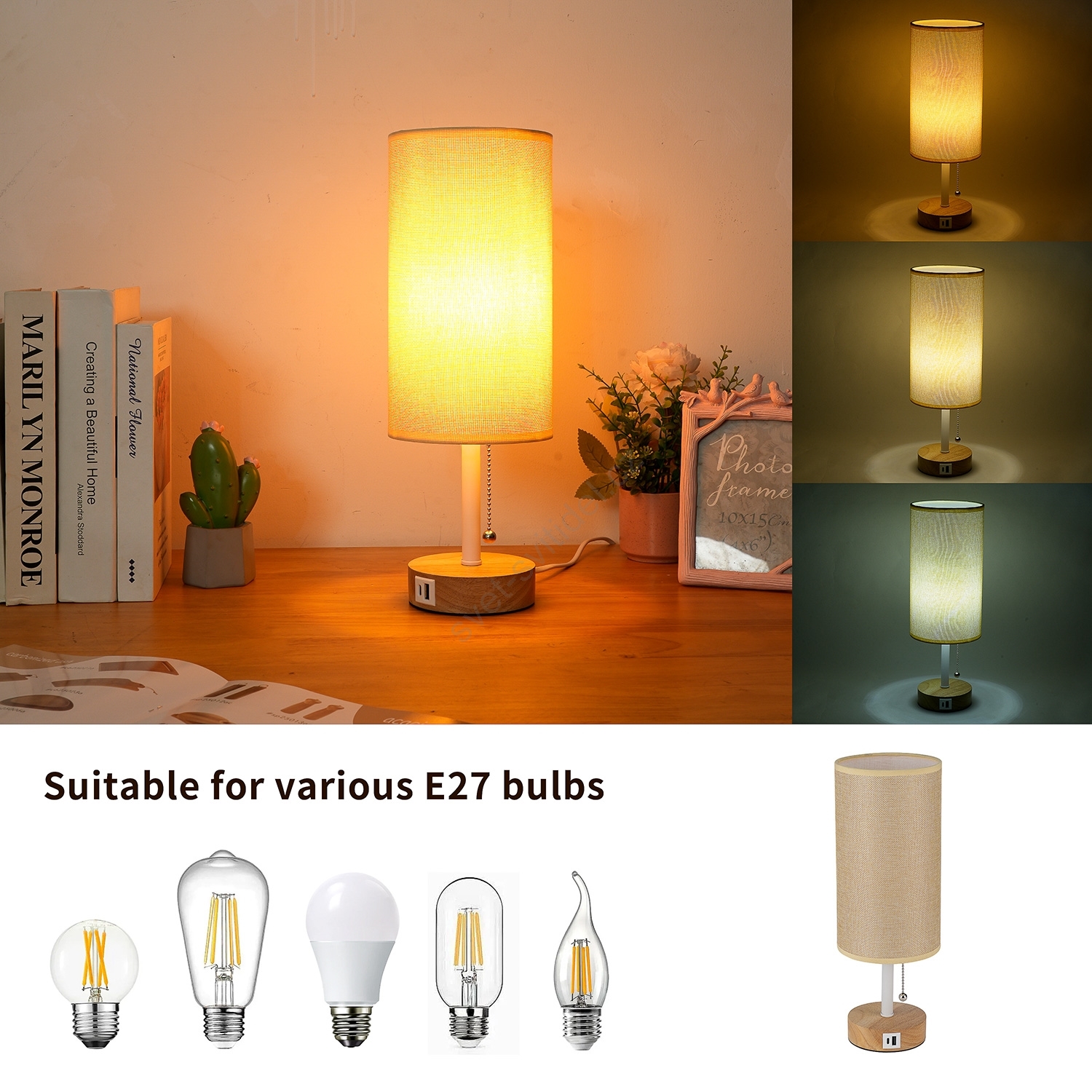 Brilagi - Stolní lampa s USB portem TABLON 1xE27/25W/230V dub/bílá/béžová