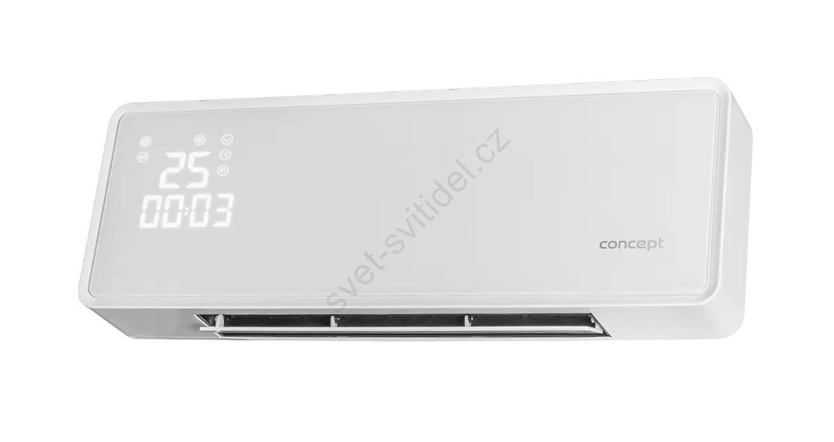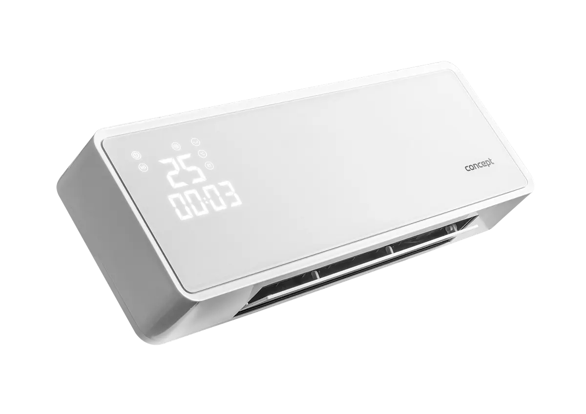 • Nástěnné keramické topidlo v moderním bílém designu se skleněným panelem.