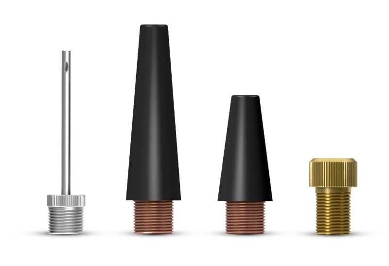 • 4 adaptéry různé velikosti: adaptér na galuskový ventil (Presta), jehlový adaptér na míče, krátký kuželový adaptér, dlouhý kuželový adaptér.