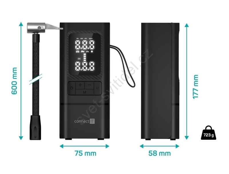 • Díky svému vysokému výkonu a podporou tlaku až 150 PSI si hravě dokáže poradit jak s nafouknutím pneumatik u auta, kola či elektrické koloběžky, tak poslouží i k nafouknutí míče, kruhu nebo matrace.