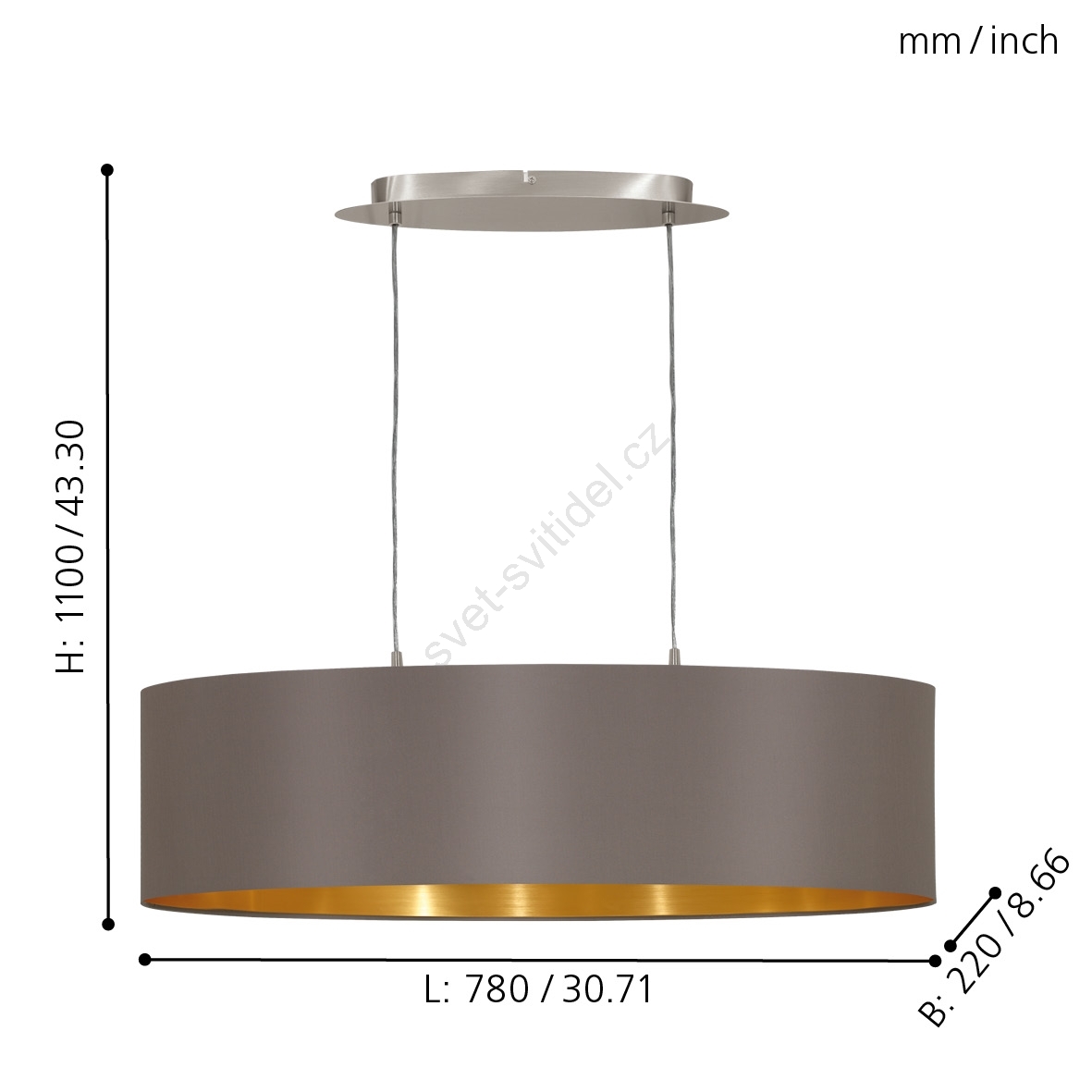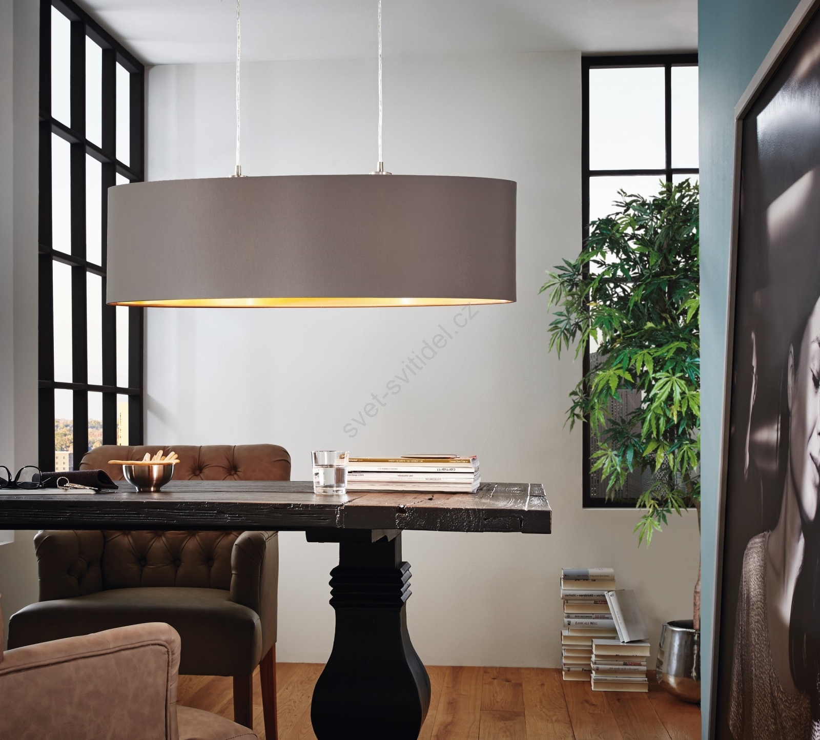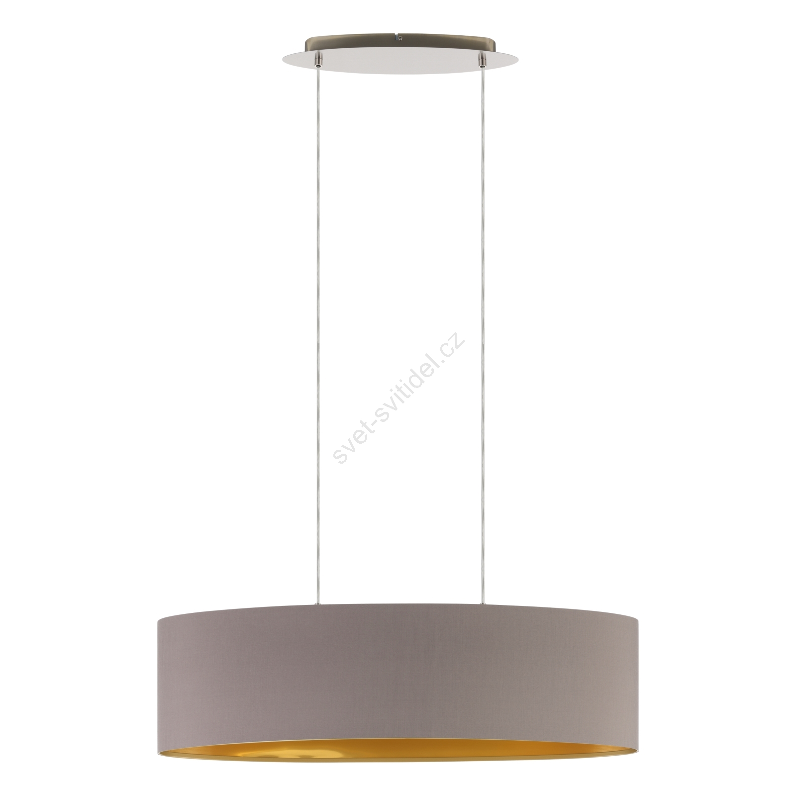 • Vzhled svítidla je podtržen oválným stínítkem vyrobeným z textilu vnější barvy cappuccino a vnitřní zlaté, doplněn závěsem z kovu.