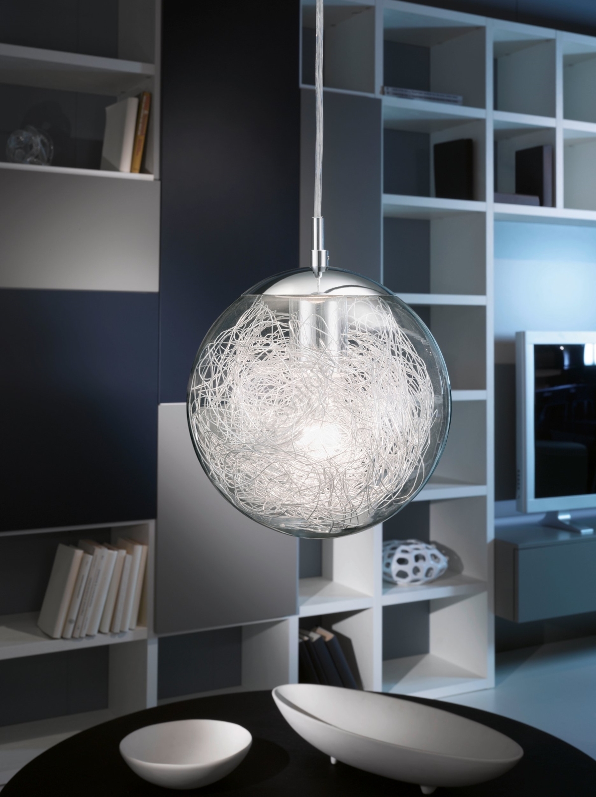 • Tento designový lustr je vyroben z kovu v povrchové úpravě leský chrom a ze skla.