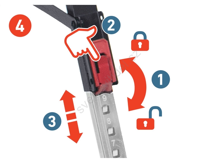 • Rozloženou kozu je možno výškově nastavit od 60 do 85 cm a to v devíti přednastavených krocích (1 krok = cca 3,3 cm).