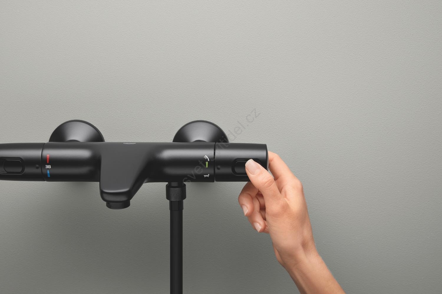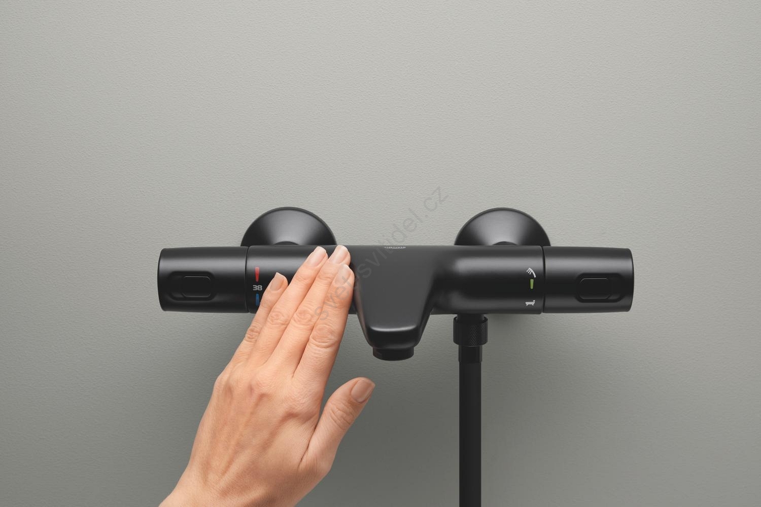 • Matně černá termostatická vanová baterie pro moderní vzhled koupelny.