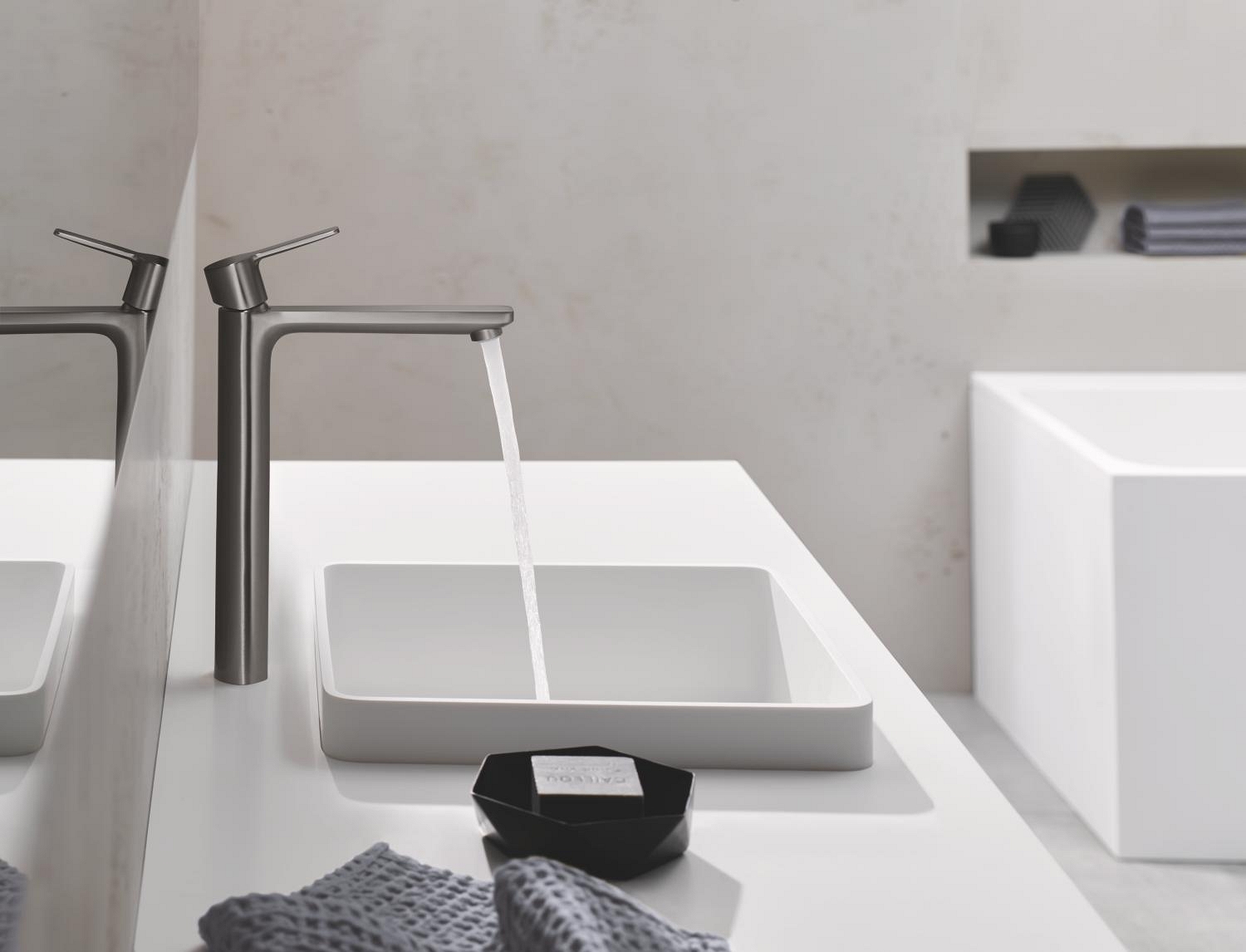 • Elegantní páková umyvadlová baterie GROHE Lineare s extra vysokou výpustí, ideální pro volně stojící umyvadla.