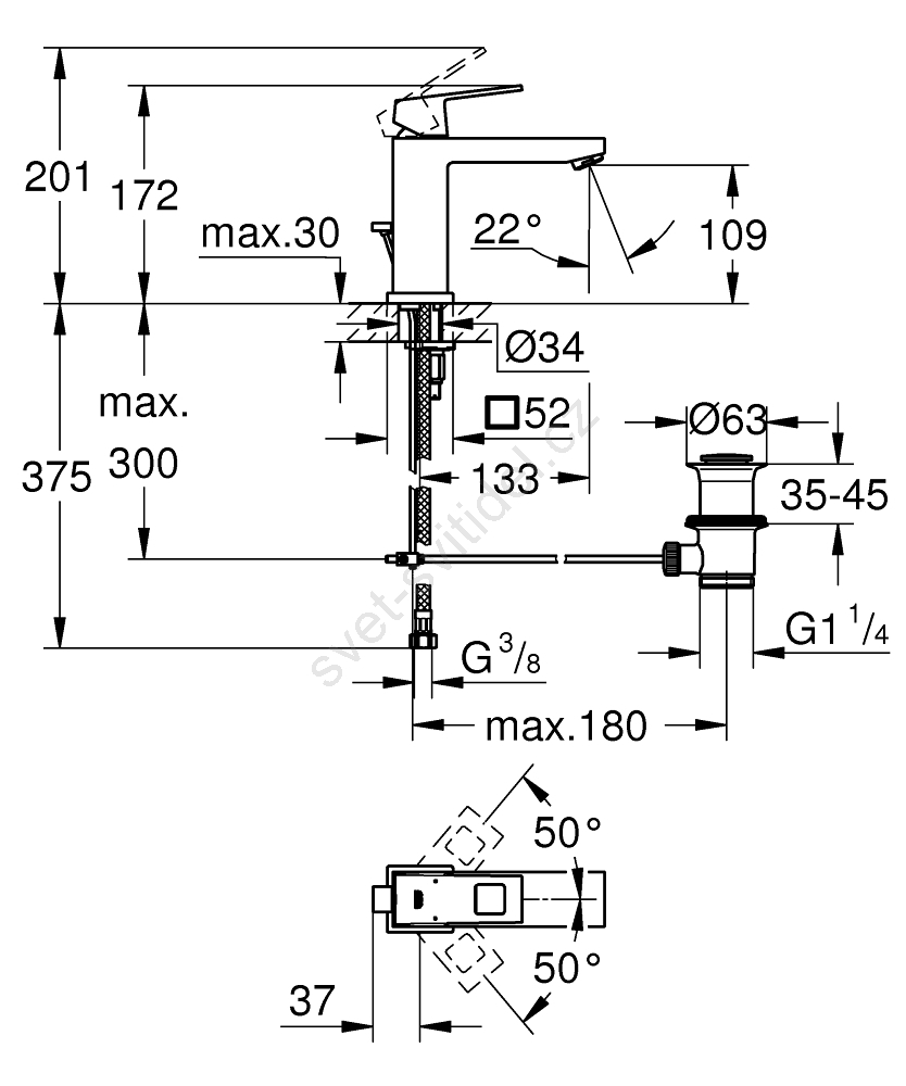 • Výška baterie 172 mm a délka výtoku 133 mm poskytují komfortní prostor pro mytí.