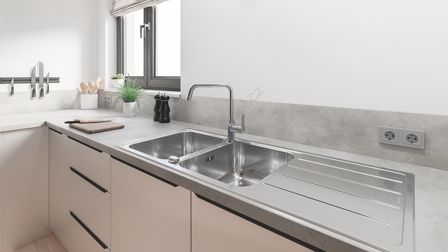 • Dvojitý nerezový dřez s odkapávačem pro maximální flexibilitu v kuchyni.