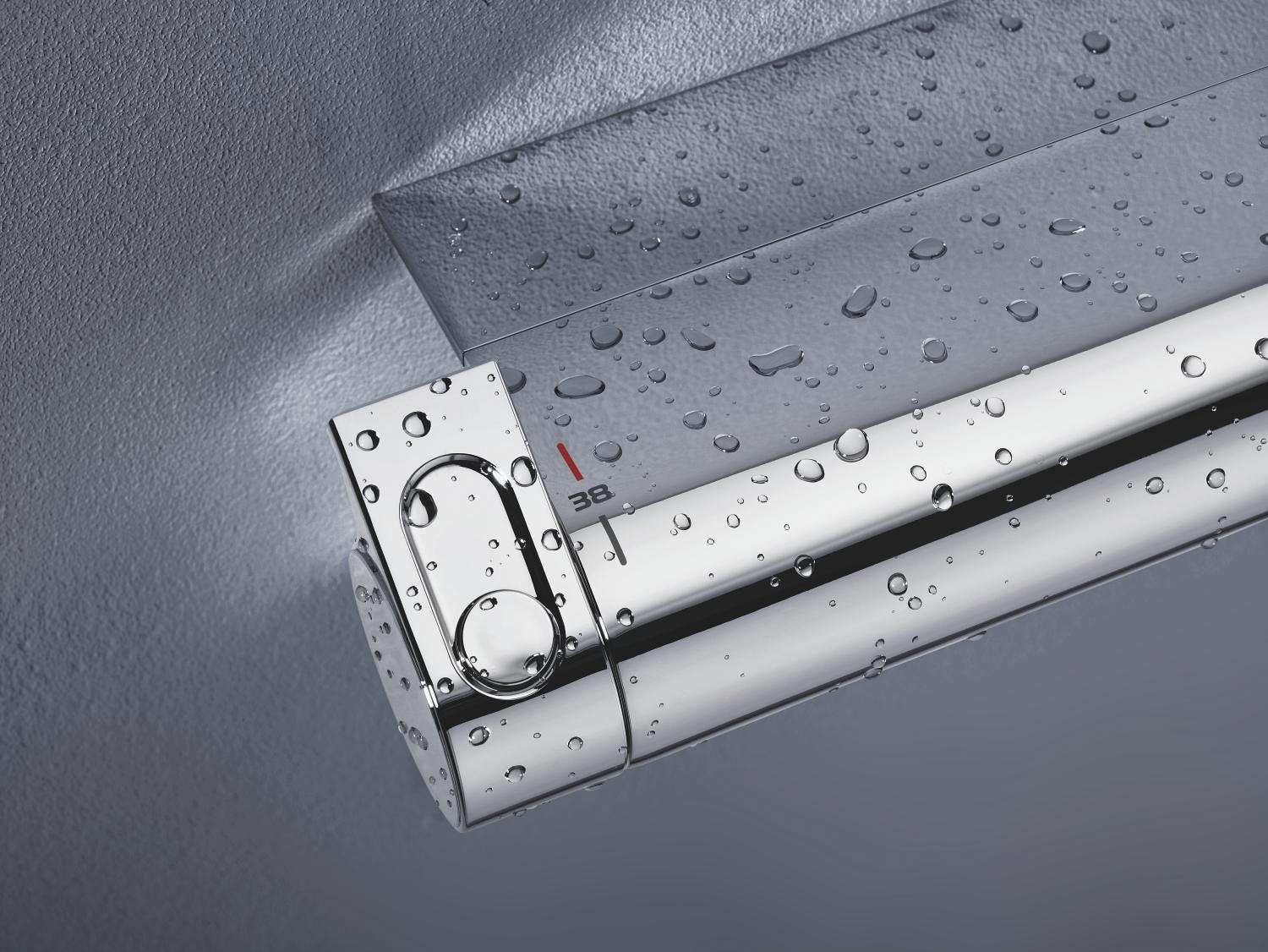 • Teplotní rukojeť se stupnicí a bezpečnostní zarážkou GROHE SafeStop na 38 °C.