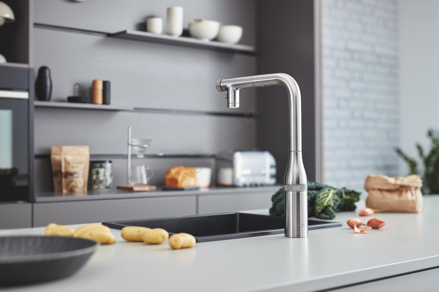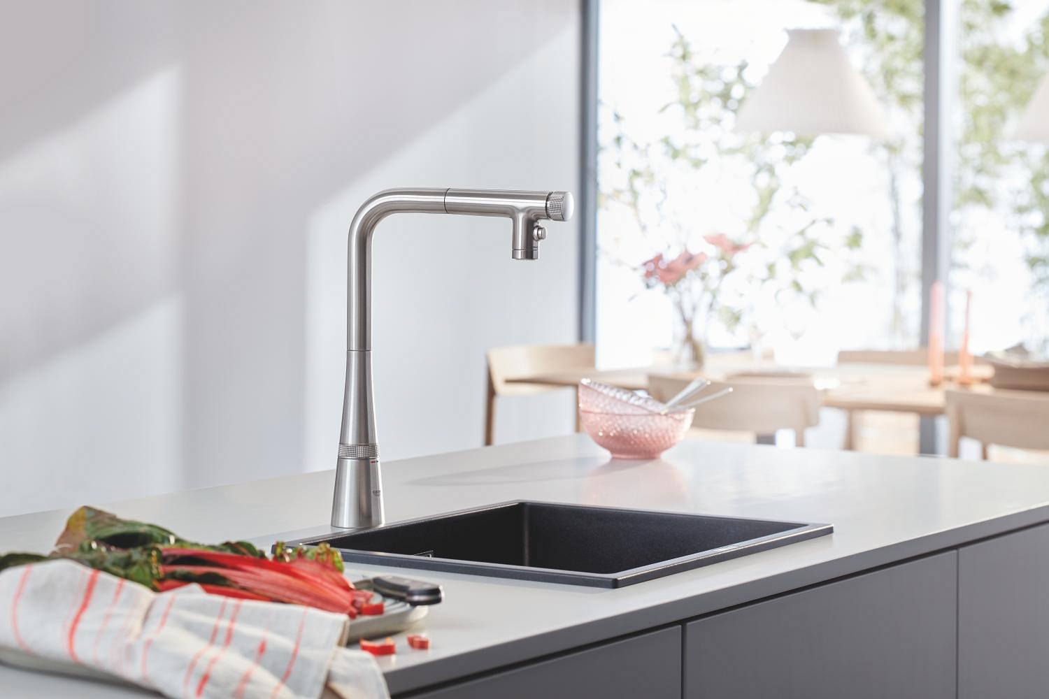 • Moderní kompozitní dřez GROHE K700U pro elegantní vzhled kuchyně.