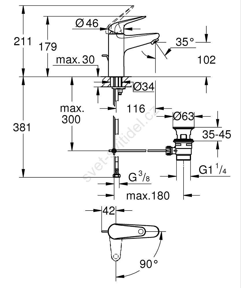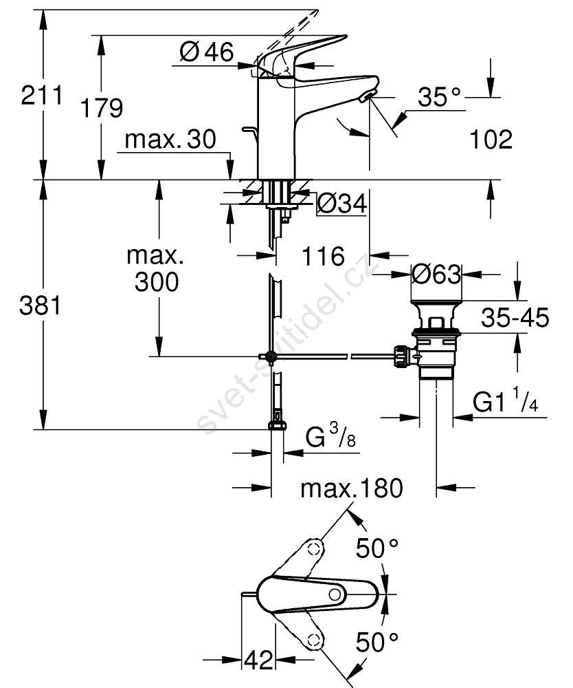 • Páková umyvadlová baterie velikosti M s výškou 179 mm a délkou raménka 116 mm.
