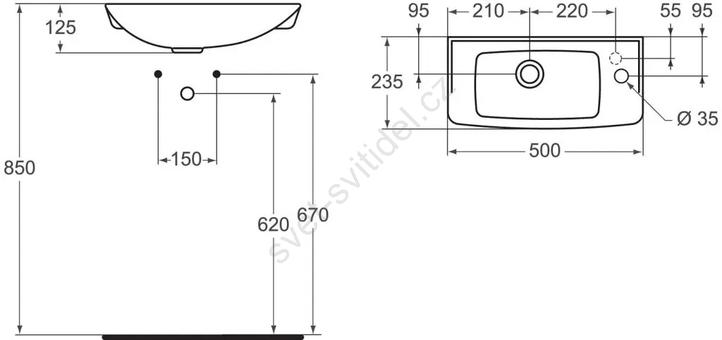 • Umývátko má jeden předpřipravený otvor pro montáž umyvadlové baterie, který je umístěn na pravé straně.