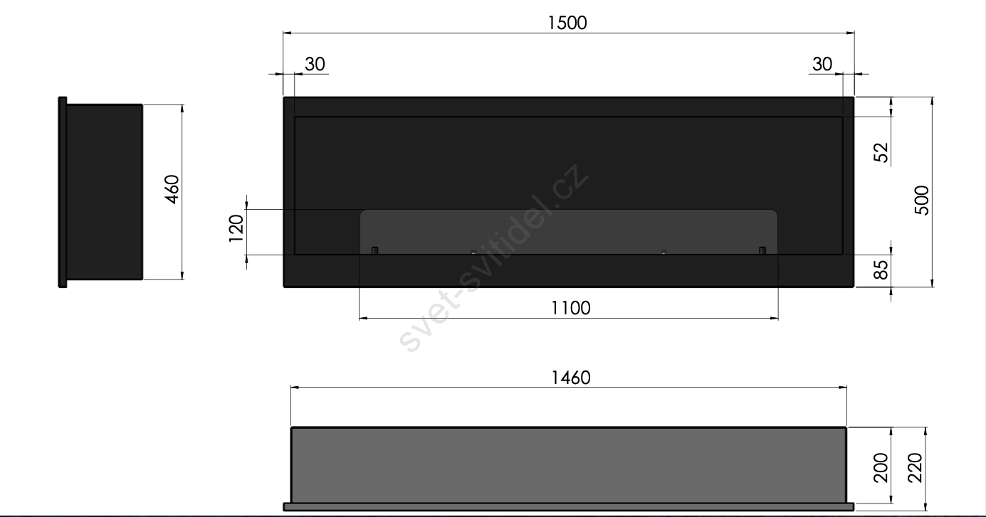 • Rozměry krbu: 50 x 150 x 22 cm.