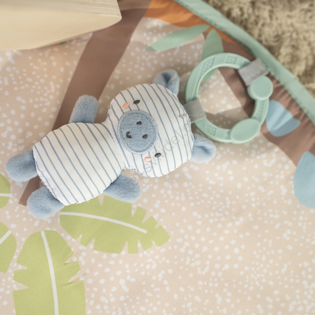 • Součástí balení je 5 atraktivních hraček, které rozvíjejí smysly, hmat i sluch: šustící plameňáková žirafa, texturovaný lístek, jemná zebra, šustící slůně a bezpečné látkové zrcátko.