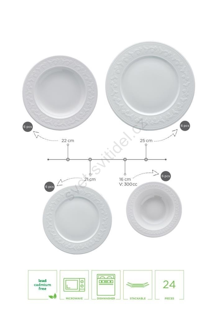 • Talíř: 22 x 22 x 4 cm (6 ks).