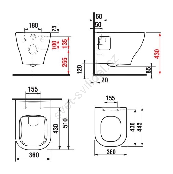 • Závěsná toaleta s hlubokým splachováním bez oplachového kruhu.