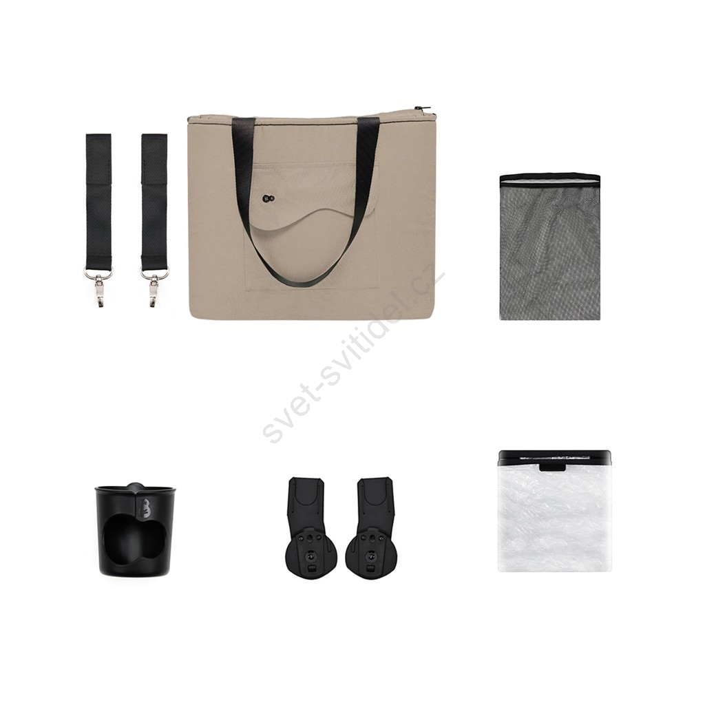 • Ke kočárku patří také řada praktického příslušenství, jako je moskytiéra, pláštěnka, držák na nápoje, taška na rukojeť pro rodiče a adaptéry na autosedačku.