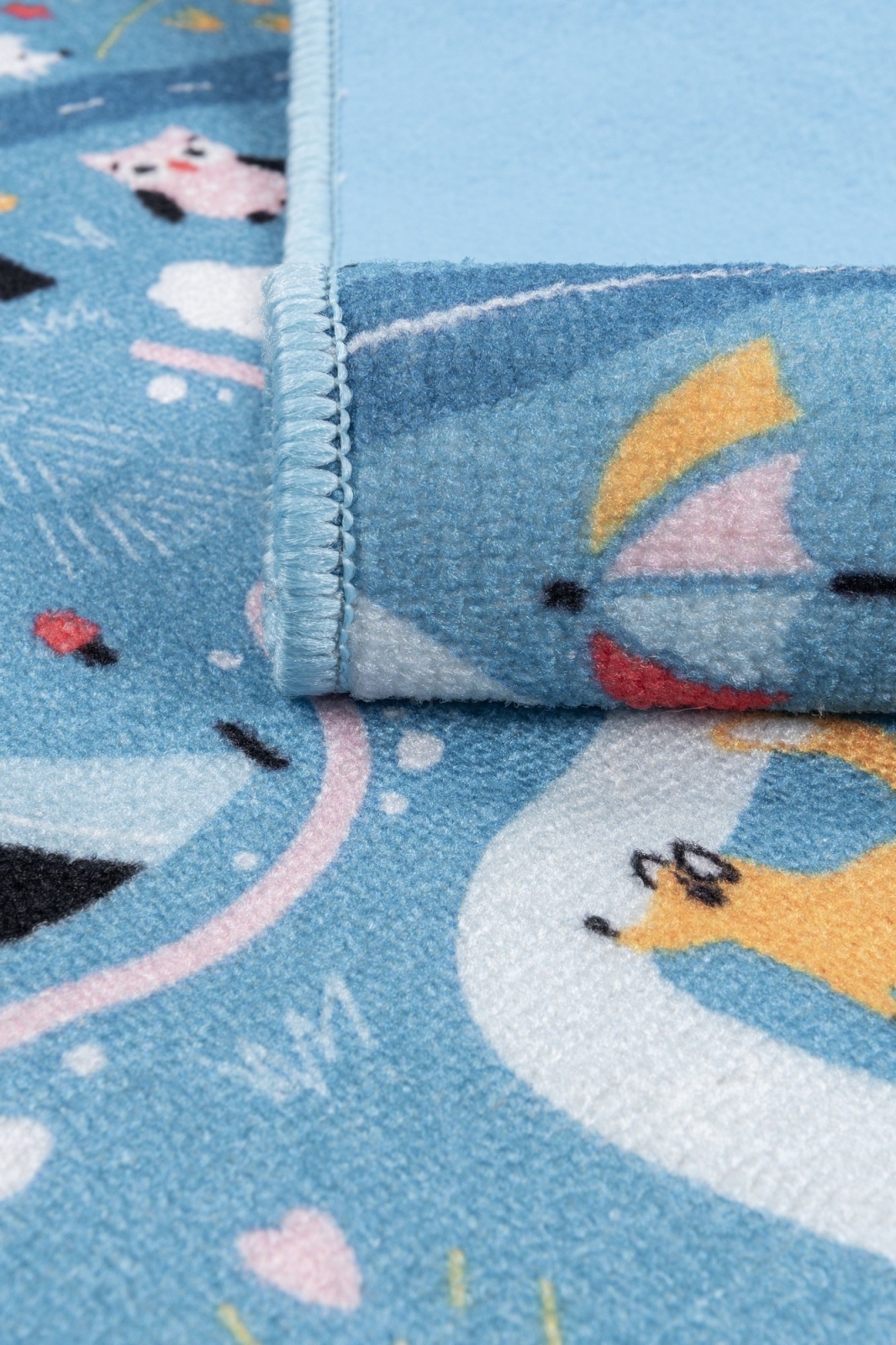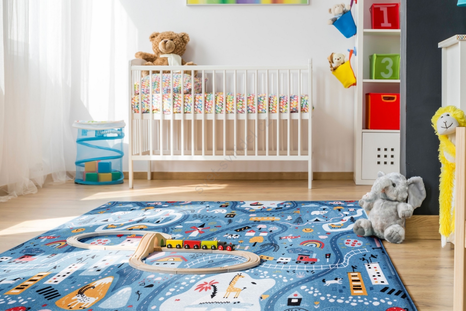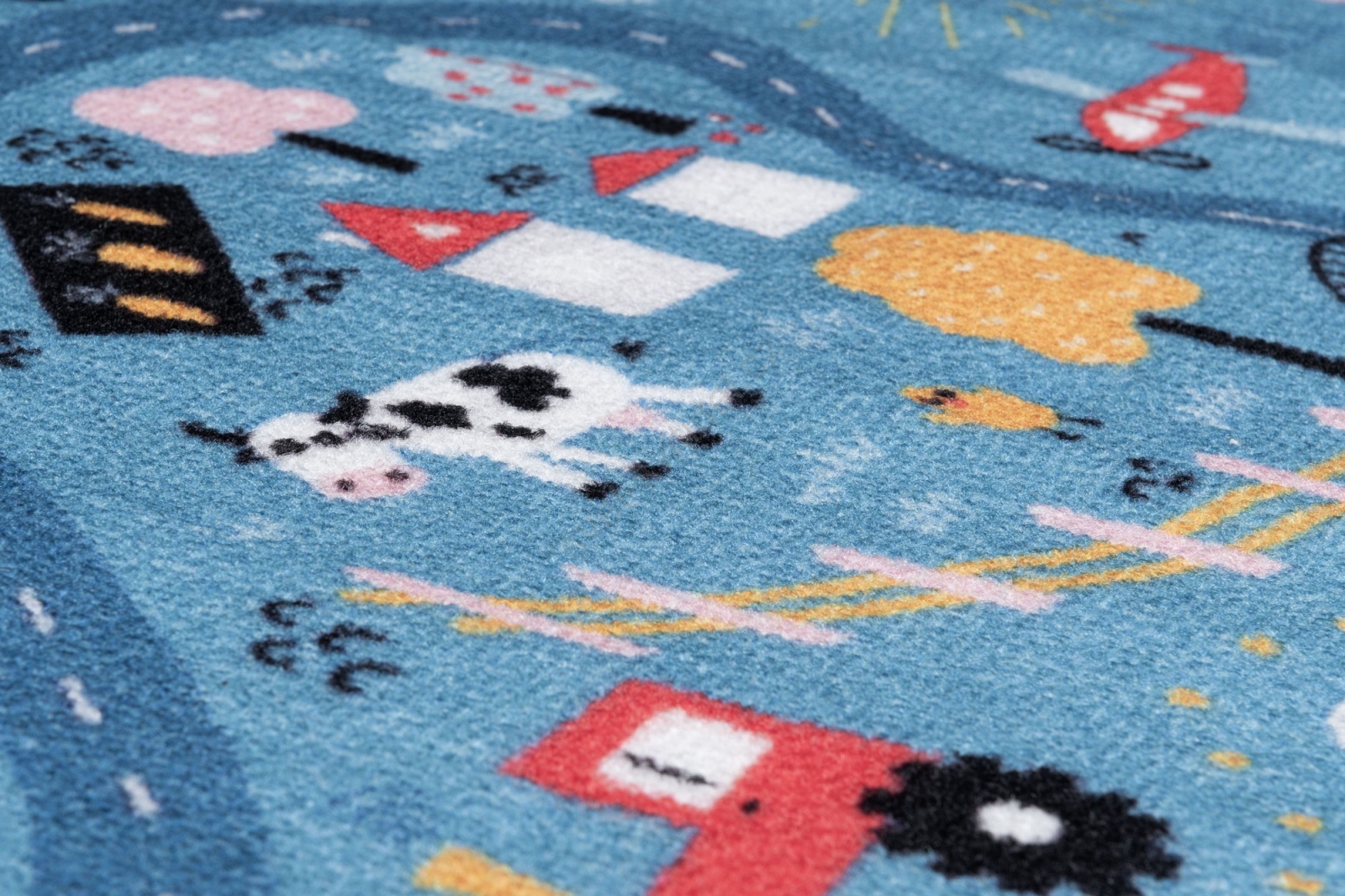 • Barevný dětský koberec se vzorem města.