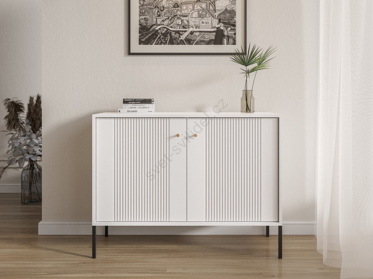 • Má dvě poličky s dvířky s vertikálním žebrováním.