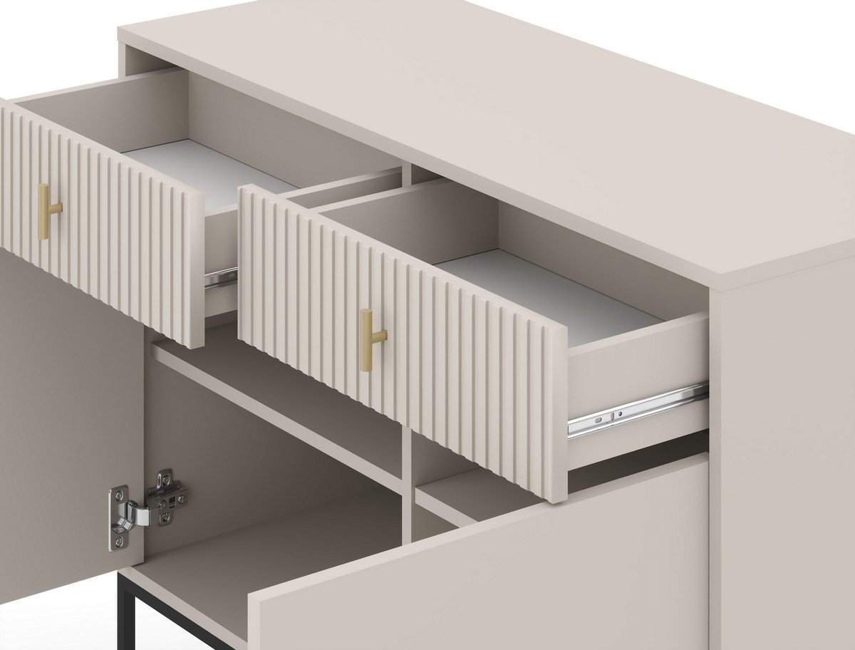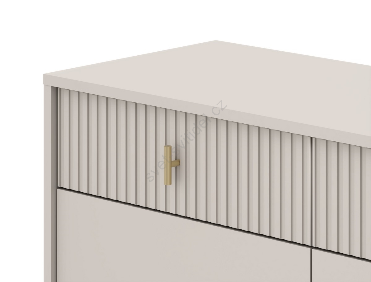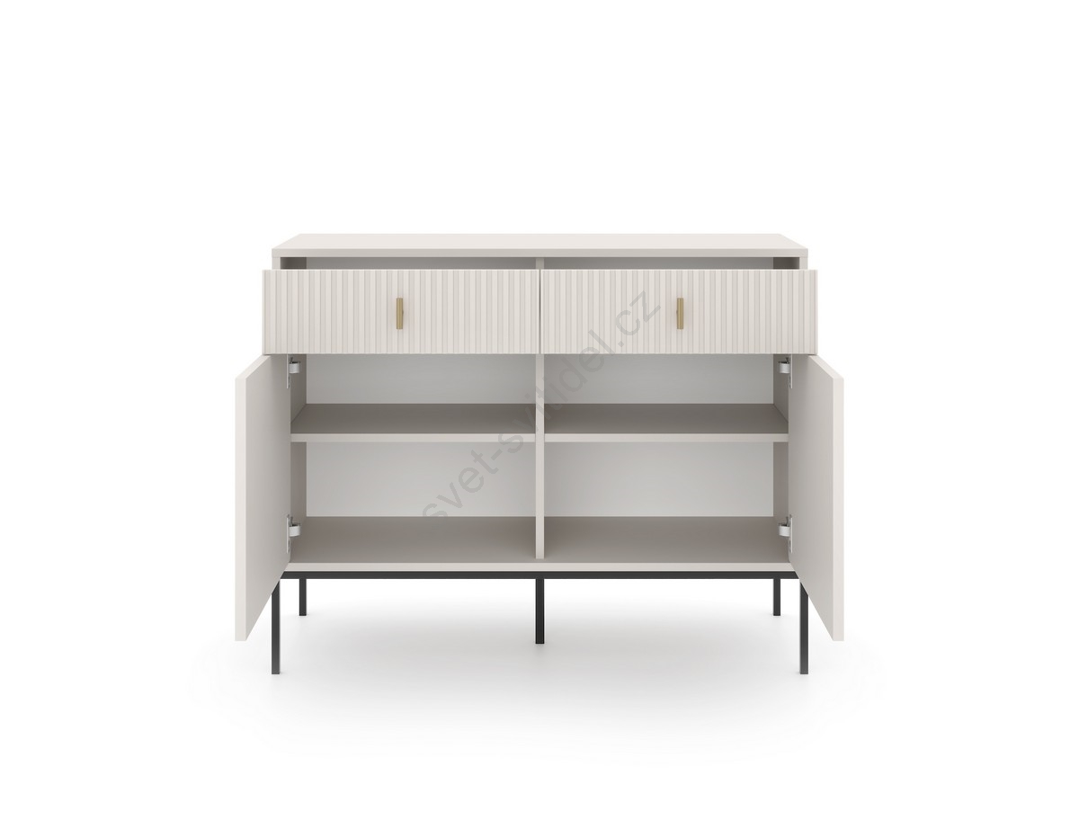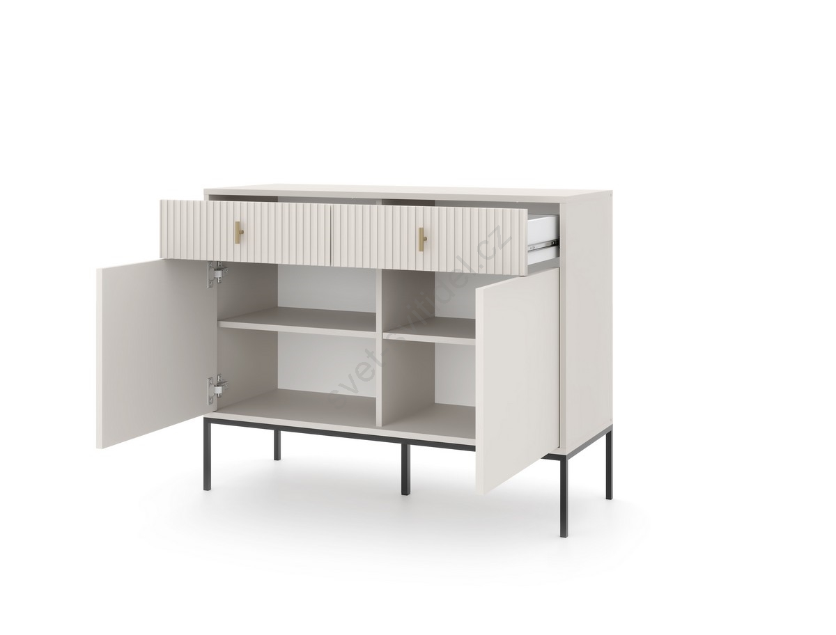 • Má dvě spodní dvířka s velkým úložným prostorem a dvě zásuvky s úchyty a vertikálním žebrováním.