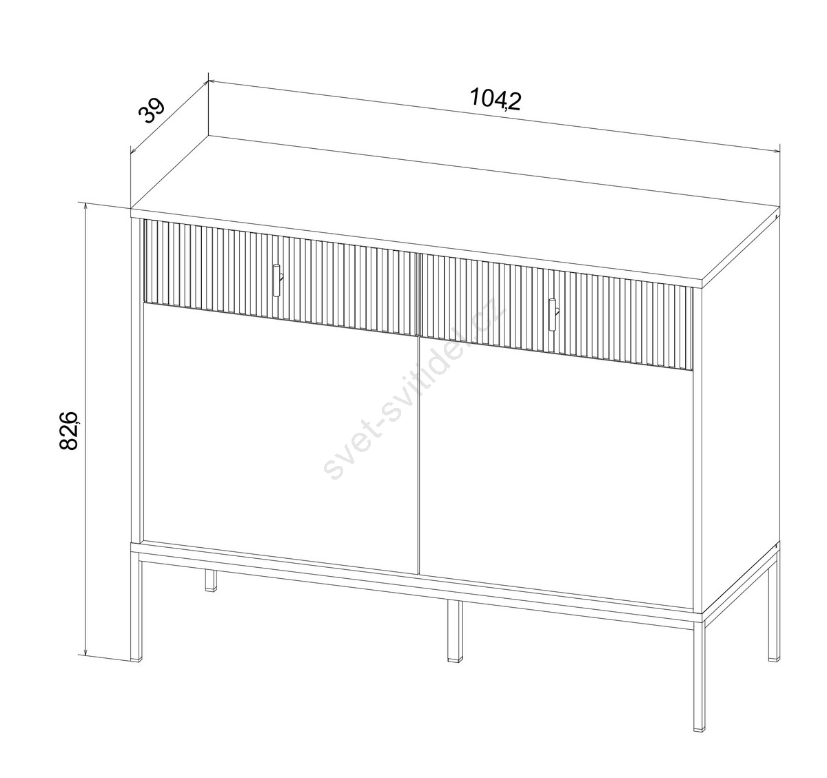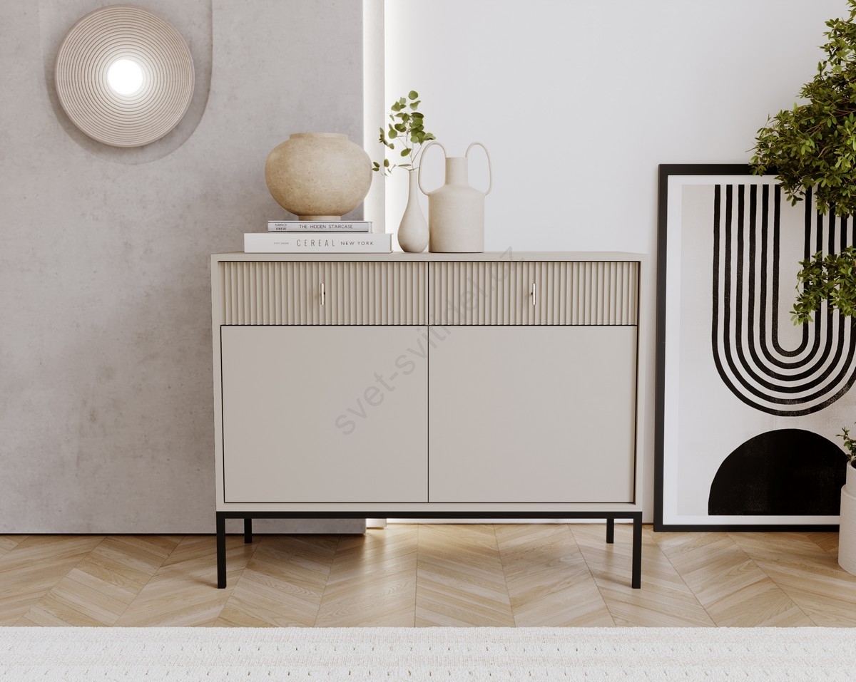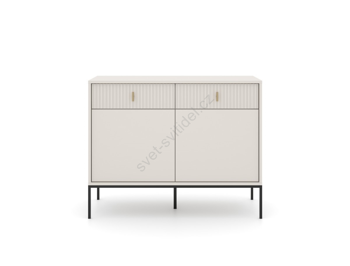 • Má dvě spodní dvířka s velkým úložným prostorem a dvě zásuvky s úchyty a vertikálním žebrováním.
