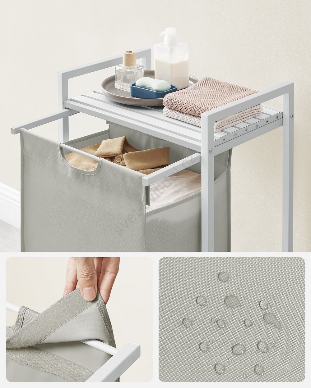 • 1 pytle, 1 police – Uložte si prádlo do látkového pytle (65 l) a vložte prací prostředky, aviváž a další věci na polici nad ním.