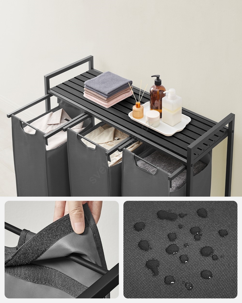 • 3 pytle, 1 police – Roztřiďte si prádlo do tří látkových pytlů (38 l na pytel) a vložte prací prostředky, aviváž a další věci na polici.