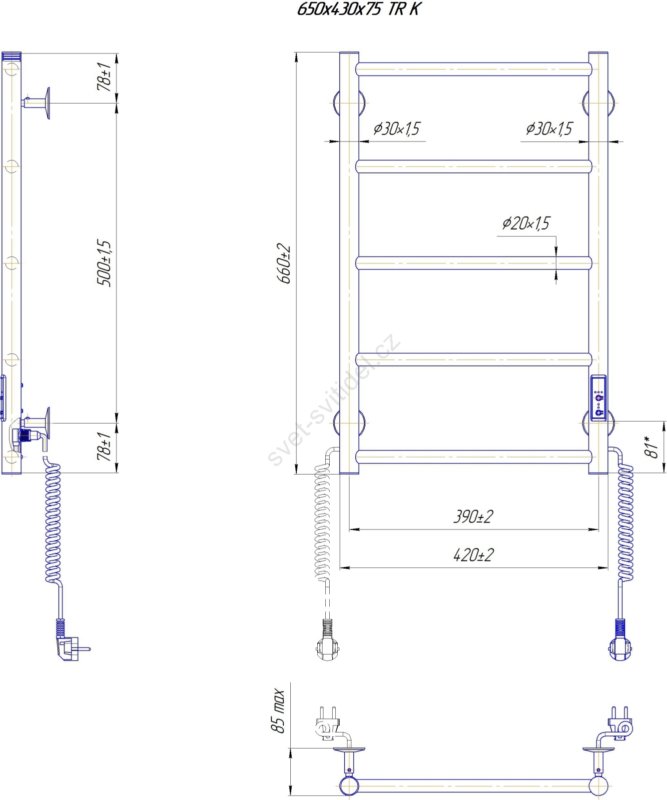 Koupelnový žebříkový radiátor CLASSIC 65W/230V 65x43 cm nerez/bílá pravá