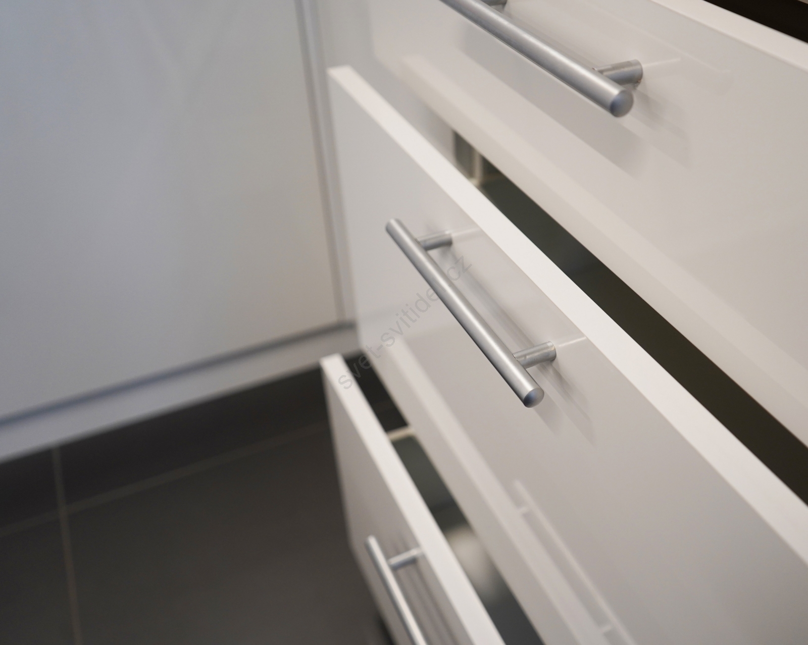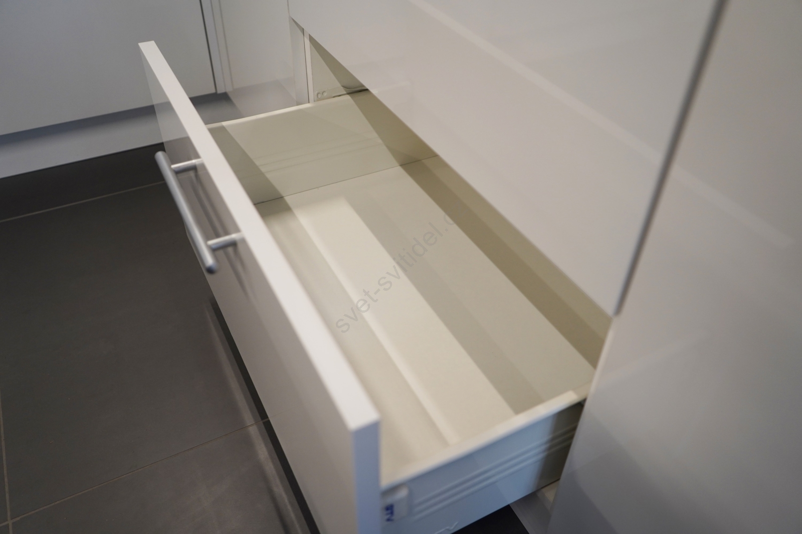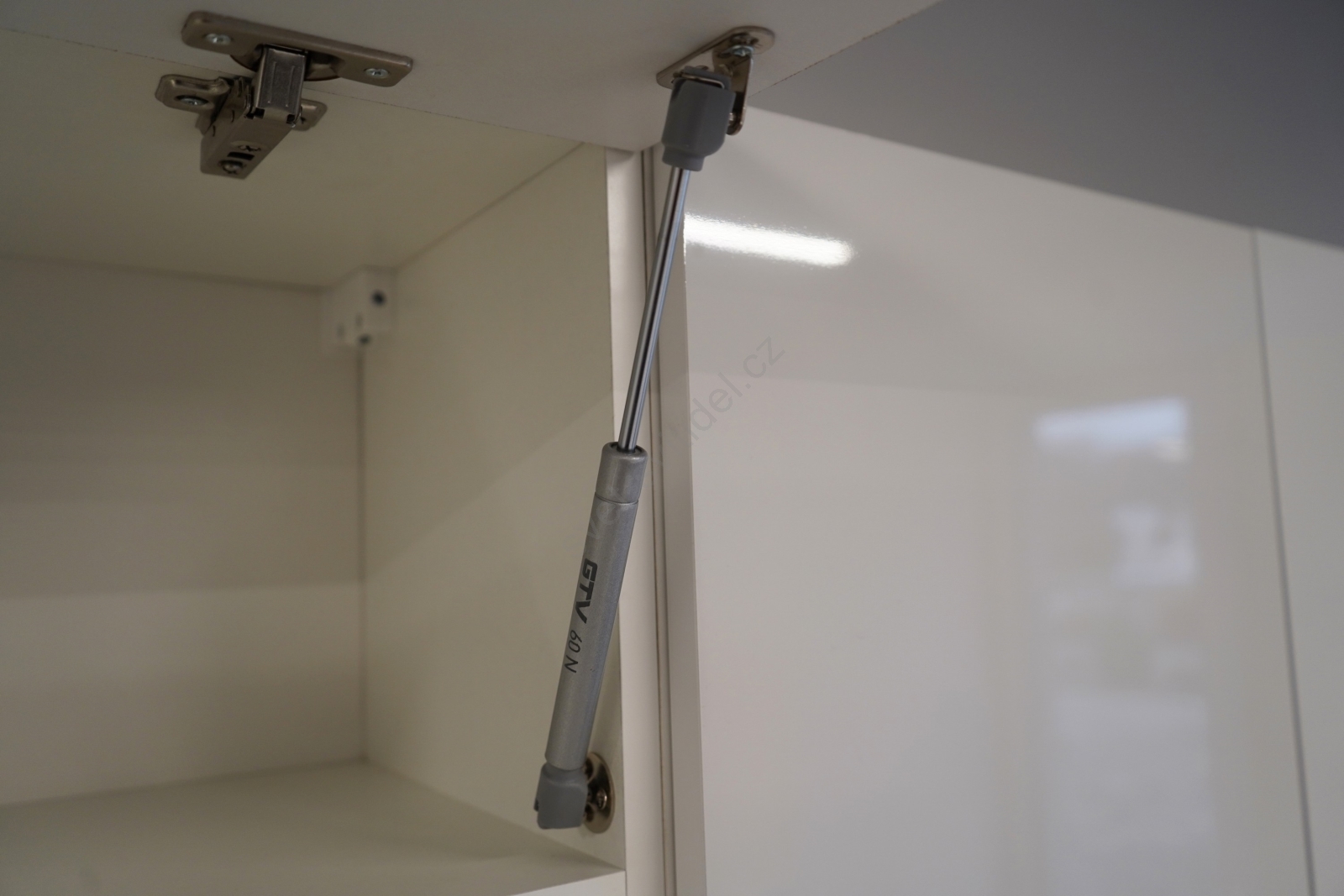 • Horní skříňky jsou opatřeny plynovými písty, v zásuvkách jsou zabudovány kvalitní zapouzdřené kovové pojezdy.