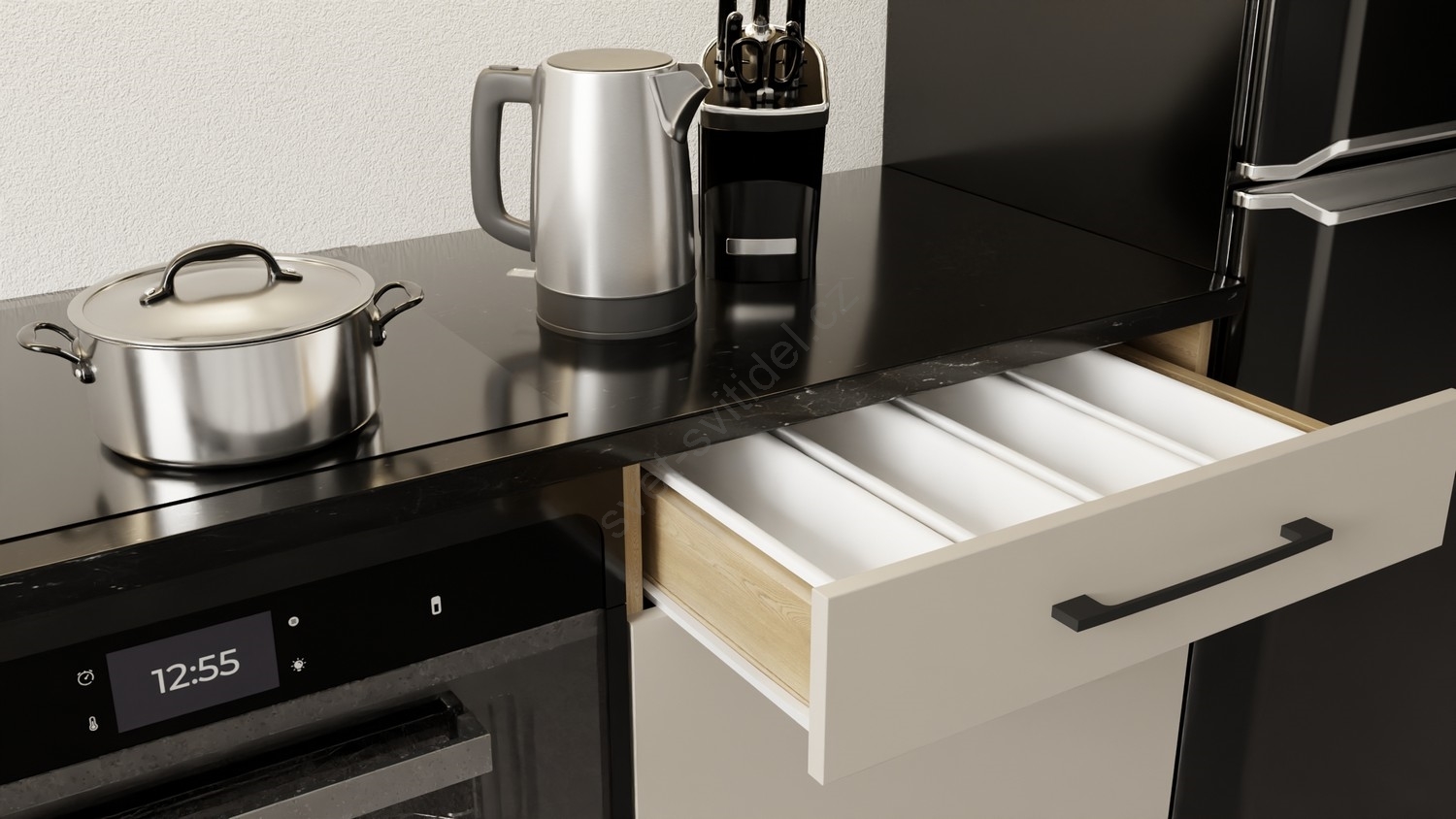 • Praktická kuchyňská linka vám poskytne prostorný členěný úložný prostor.