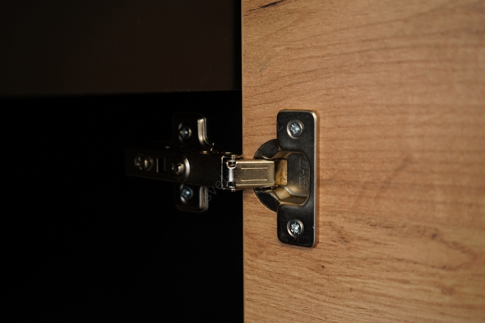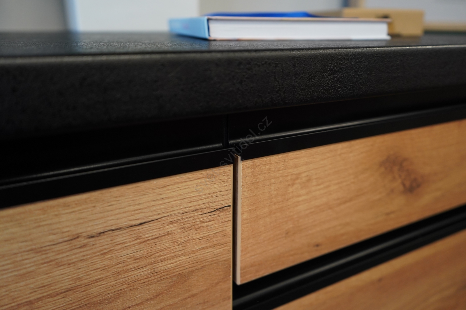 • Přední plochy horních skříněk jsou v lesklém provedení, zatímco spodní skříňky mají matnou povrchovou úpravu.