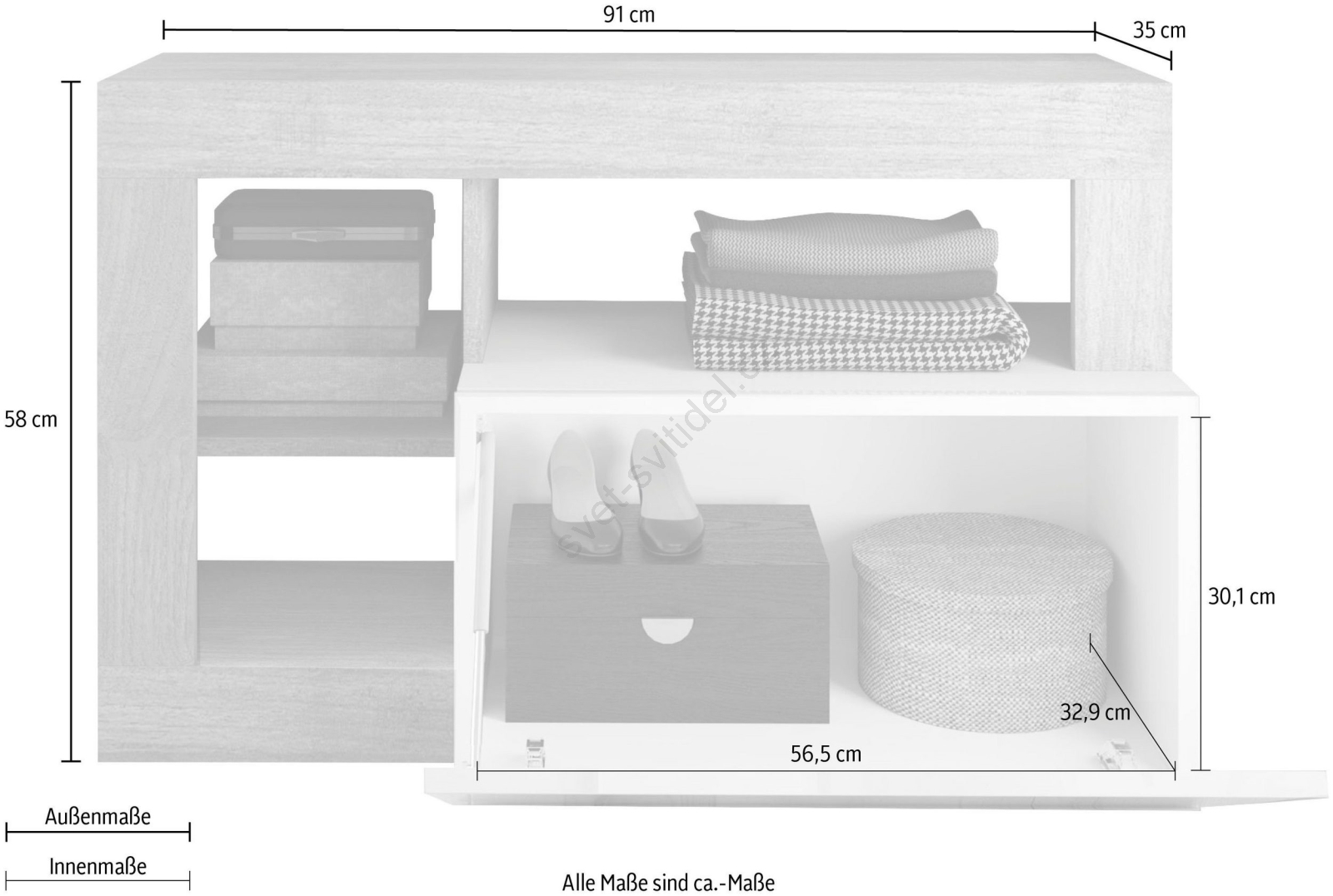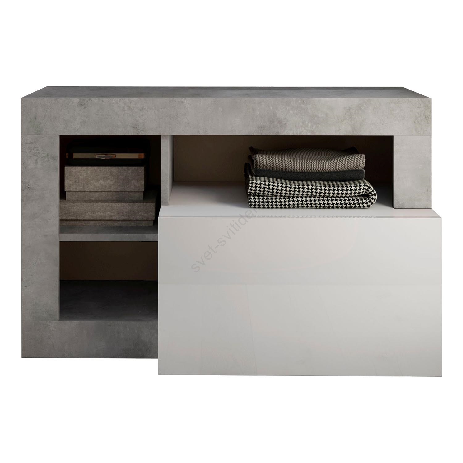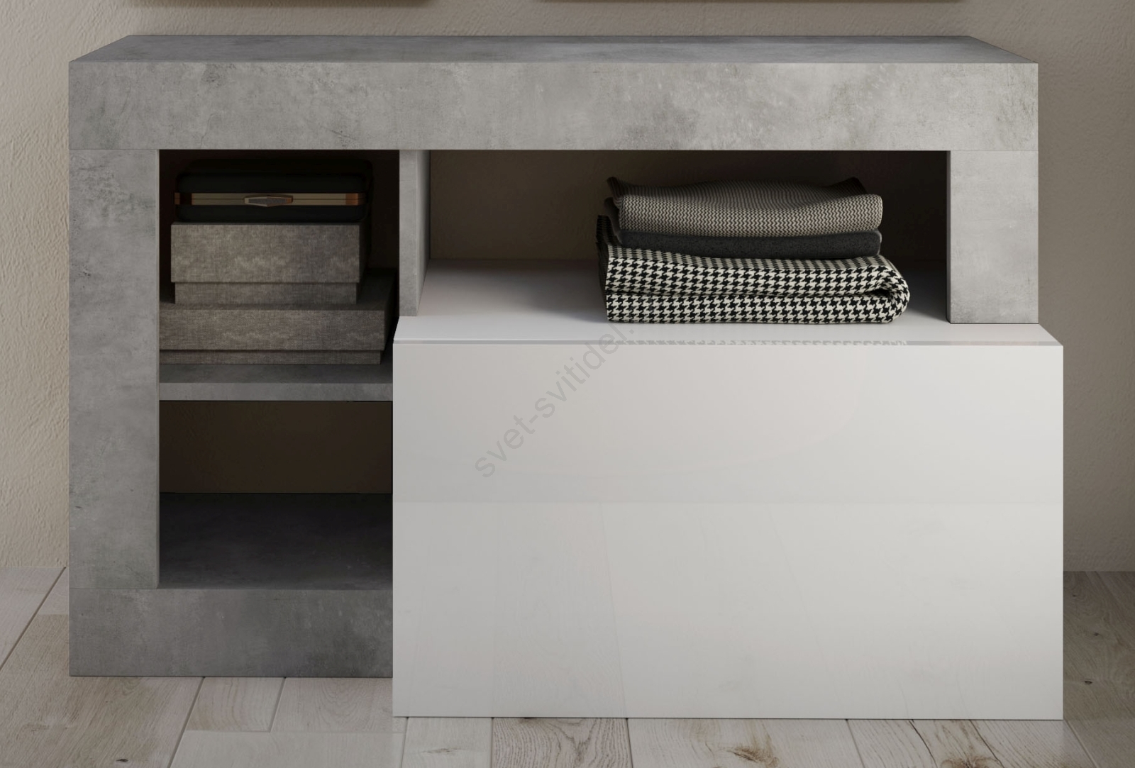 • Disponuje 3 otevřenými policemi, a vnitřní policí s výklopným otevíráním na uložení tašek, bot a sezónních věcí.