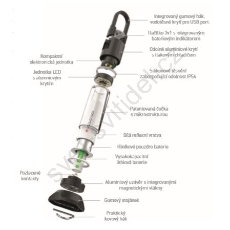 • Svítilna využívá teplou bílou LED doplněnou o červené světlo, které chrání noční vidění a je vhodné pro nenápadné osvětlení v přírodě.