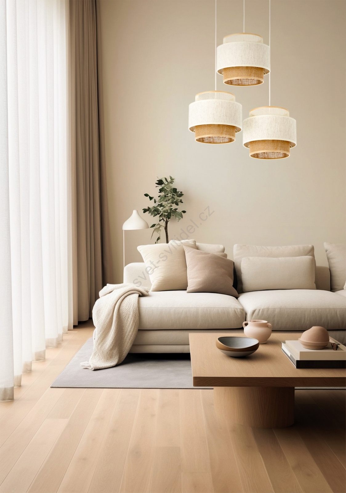 Lustr na lanku BOHO 3xE27/60W/230V bílá/juta charakterizuje pěkný design a funkční provedení. Do svítidla je určena žárovka s paticí E27. Zde si můžete koupit další žárovky za výhodnou cenu. Získáte tak zajímavý doplněk do svého domova.