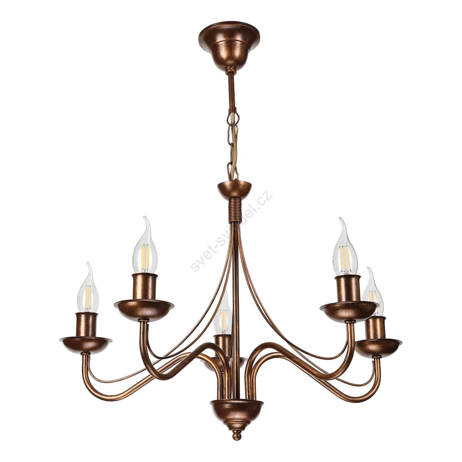 Lustr na řetězu ANTON 5xE14/15W/230V bronzová charakterizuje pěkný design a funkční provedení. Do svítidla je určena žárovka s paticí E14. Zde si můžete koupit další žárovky za výhodnou cenu. Získáte tak zajímavý doplněk do svého domova.