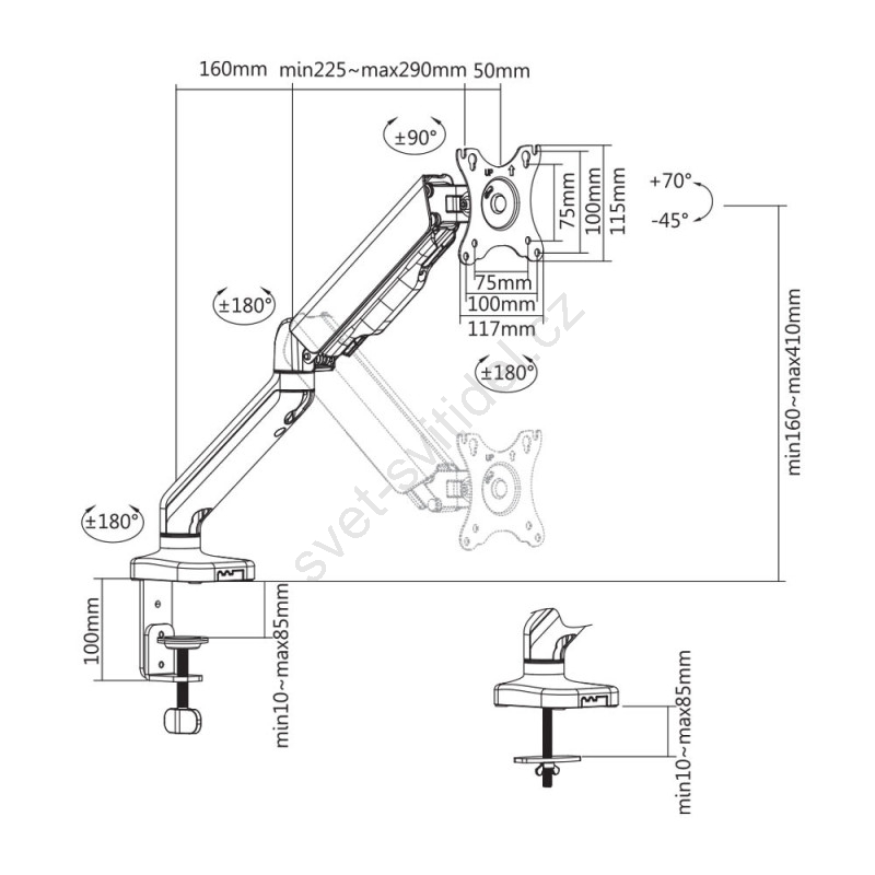 • Nabízí 2 způsoby k uchycení na desku stolu: montáž na kraj stolu (tloušťka pracovní desky 10 - 85 mm) nebo připevnění skrz pracovní desku kdekoliv na ploše stolu.