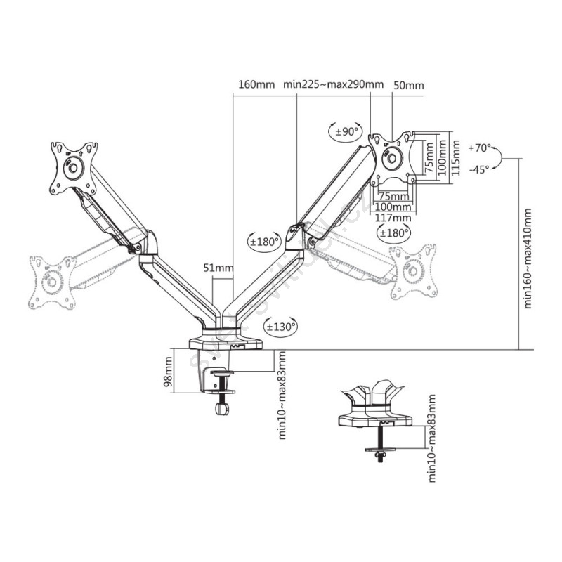 • Nabízí 2 způsoby k uchycení na desku stolu: montáž na kraj stolu (tloušťka pracovní desky 10 - 83 mm) nebo připevnění skrz pracovní desku kdekoliv na ploše stolu.