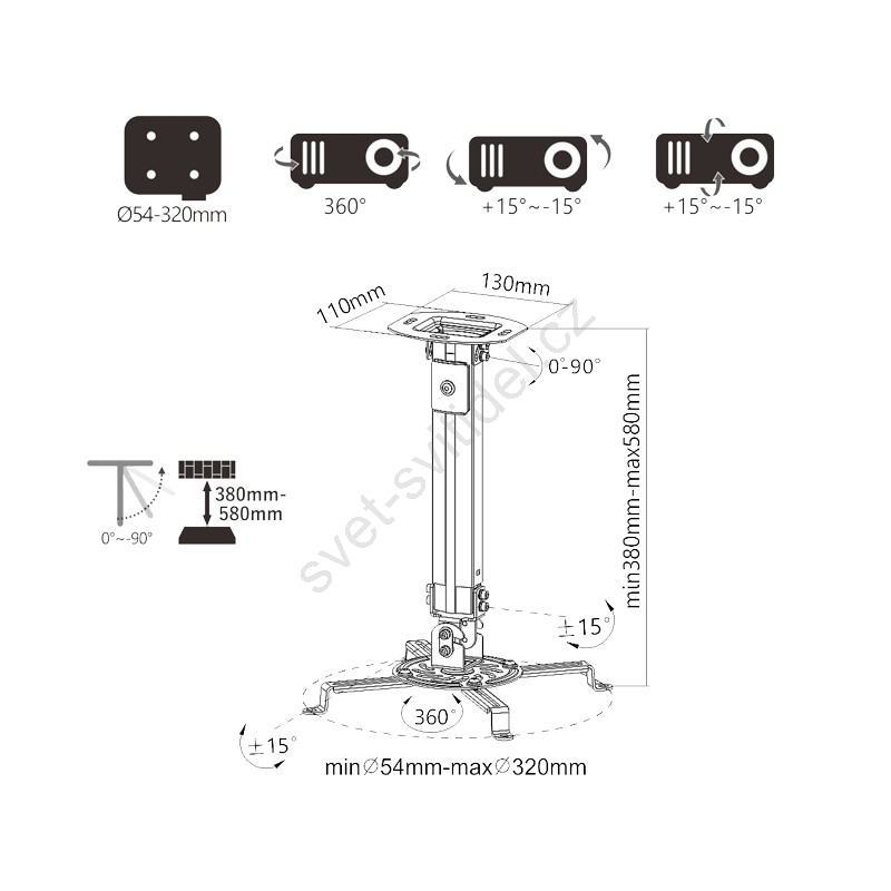 • Díky své chytré konstrukci a VESA kompatibilitě (průměr 54 - 320 mm) je držák vhodný pro drtivou většinu projektorů na trhu.