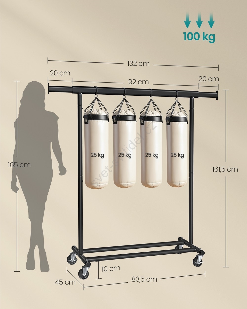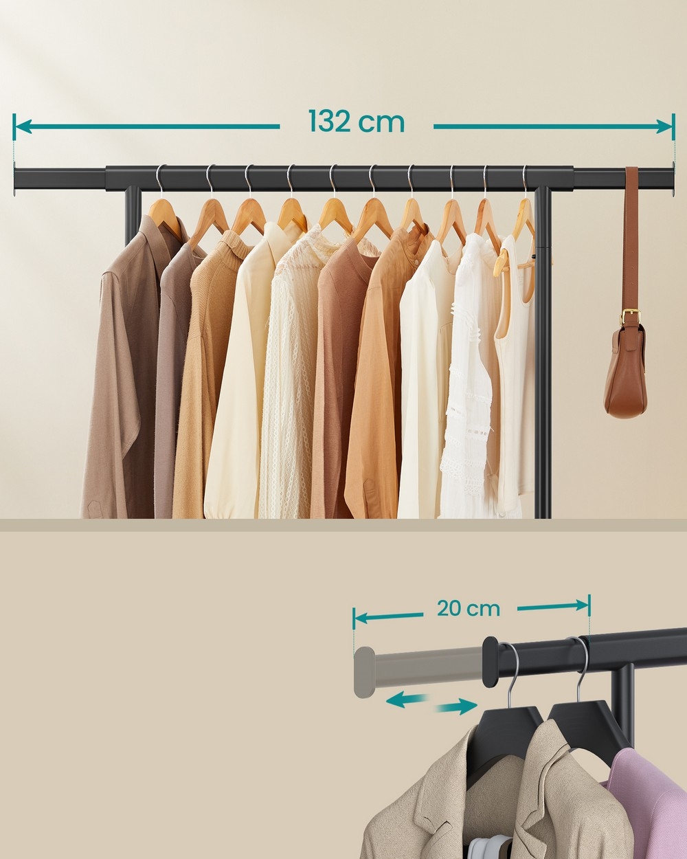 • Horní tyč unese až 100 kg (při rovnoměrném zatížení) bez kymácení nebo převrácení, výsuvná tyč poskytuje další prostor navíc, pro vaše oblečení, klobouky, tašky atd.