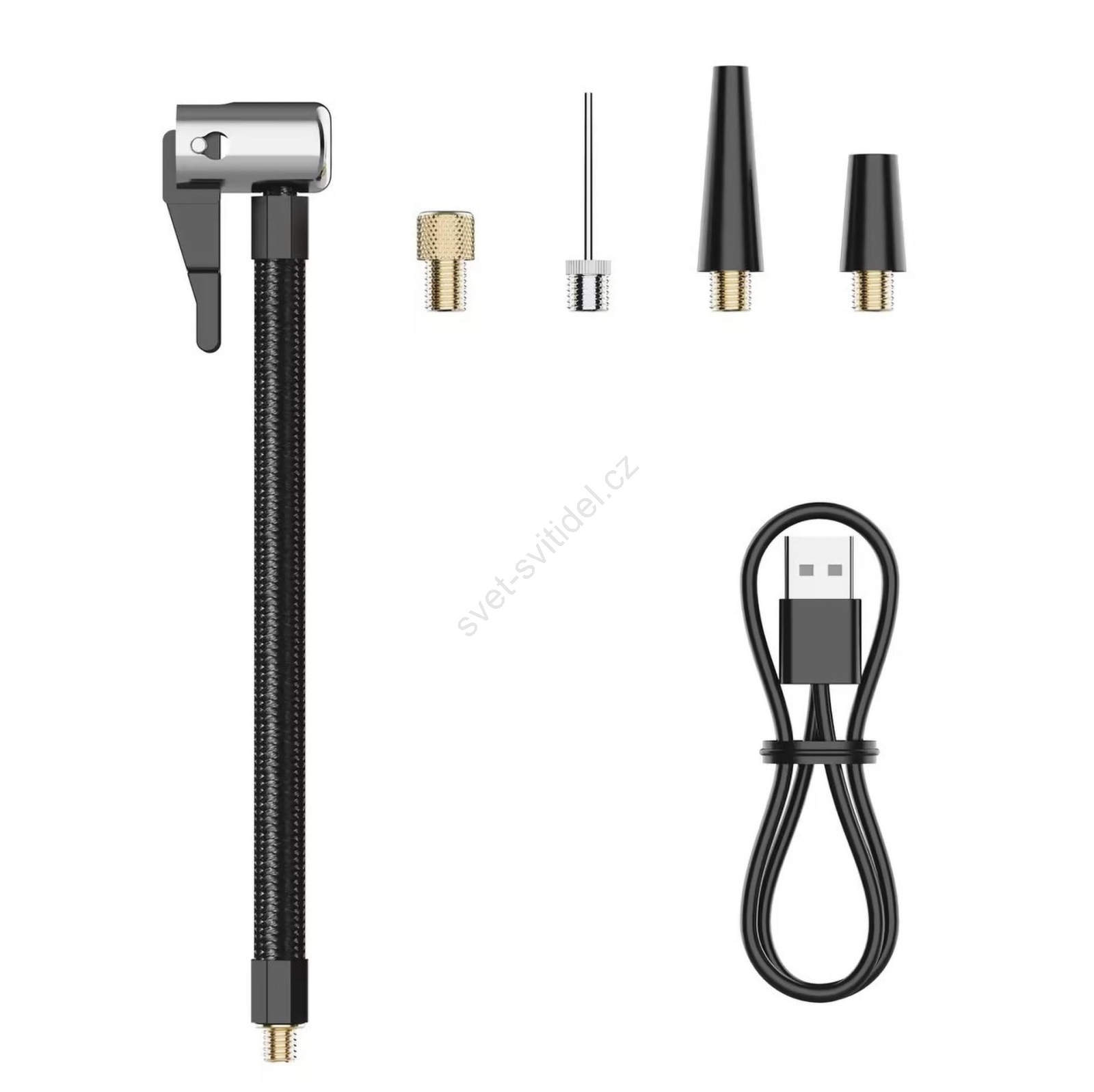 • Obsah balení: jump starter, startovací kabely, příslušenství pro kompresor (hadice, adaptéry), USB kabel a návod.