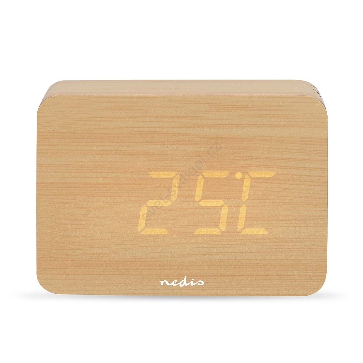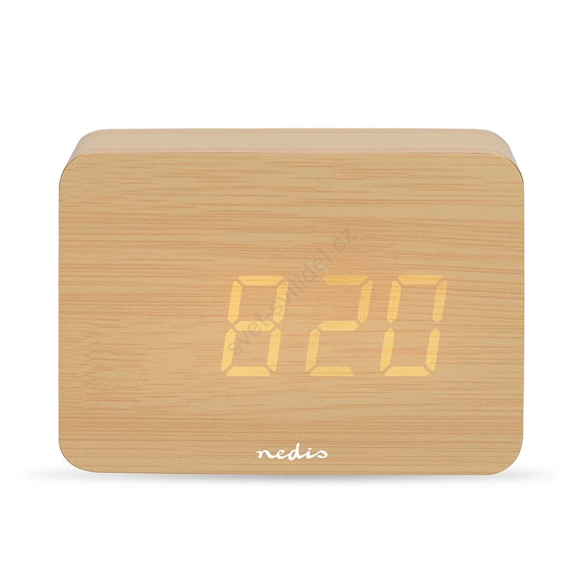 • Malý dřevěný digitální budík s datem a teploměrem.