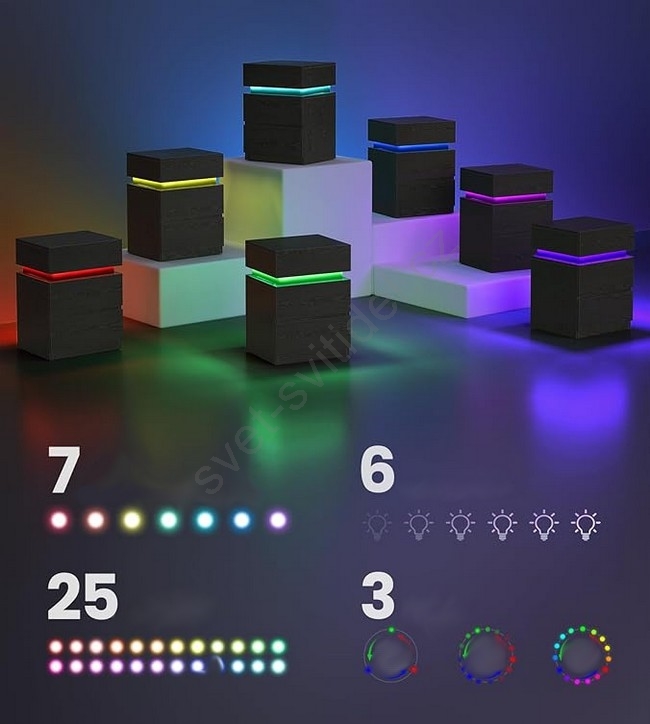 • LED světla v 25 barvách, 6 úrovních jasu, 10 režimech a 6 blikajících frekvencích.