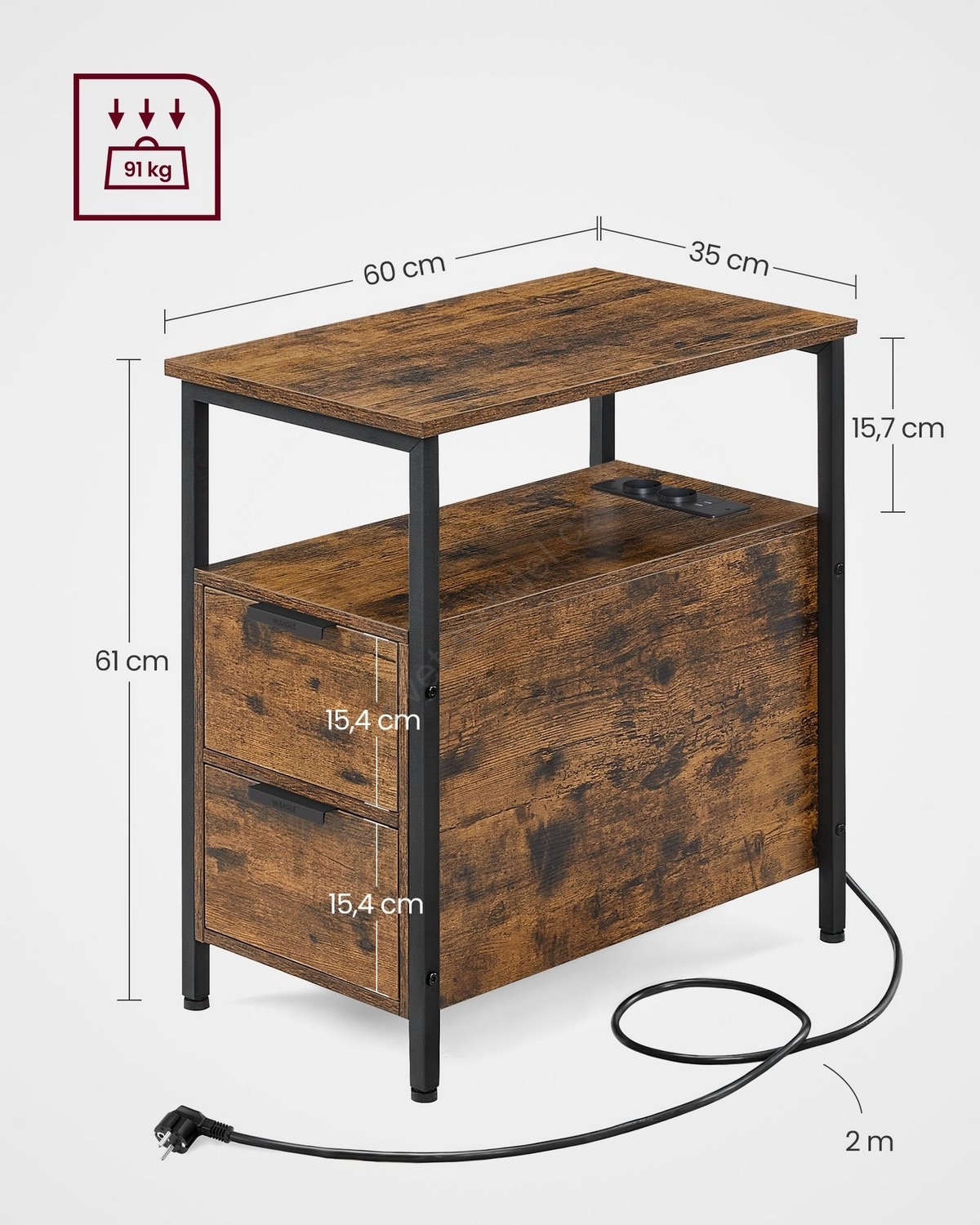 Odkládací stolek s vestavěnými zásuvkami a USB porty ROD 65x35 cm hnědá/černá